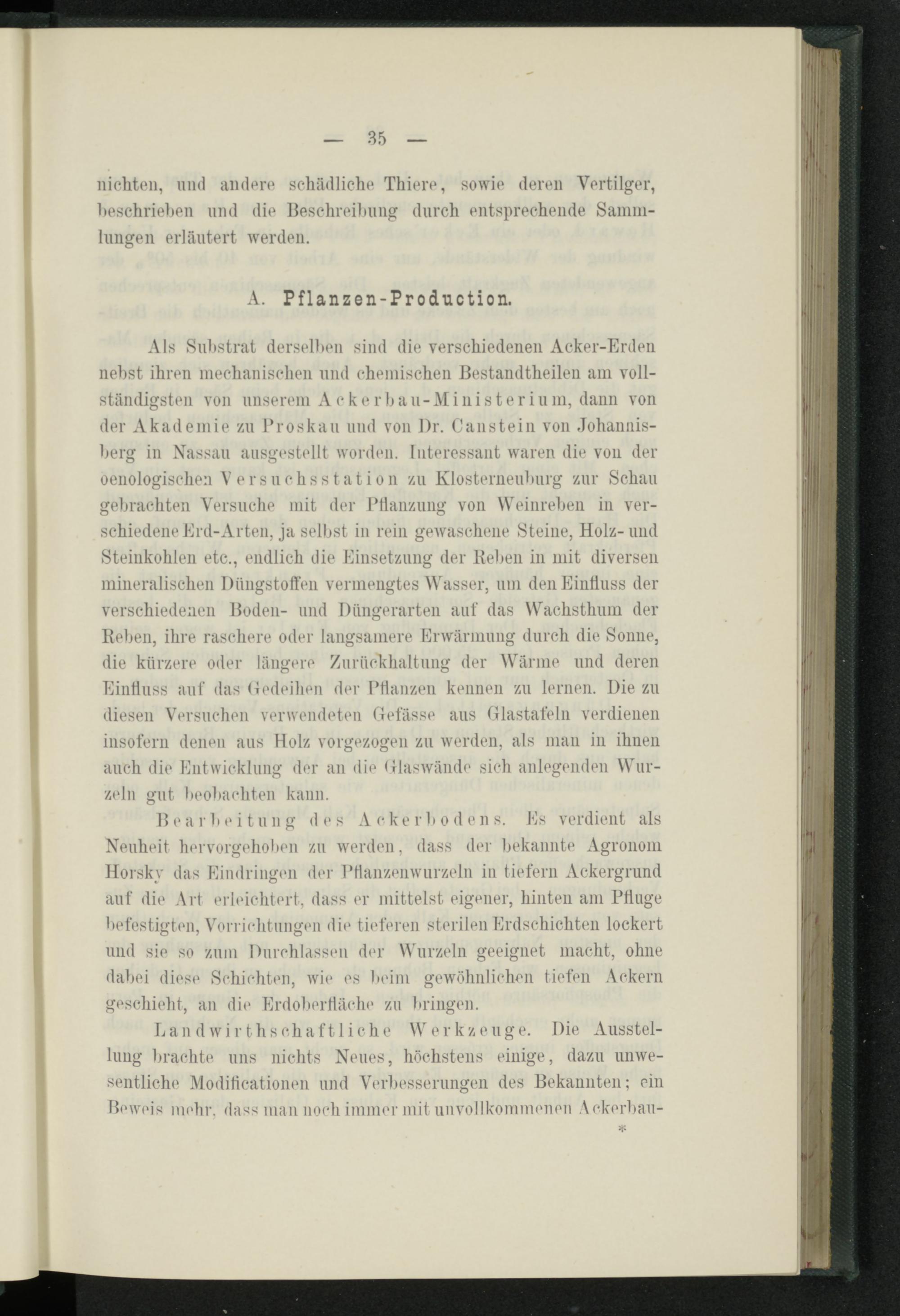 Als Substrat derselben sind die verschiedenen Acker-Erden nebst ihren mechanischen und chemischen Bestandteilen am vollständigsten von unserem A c k e r b a u - M i n i s t e r i u in, dann von der Akademie zu Broskau und von l)r. Canstein von Johannisberg in Nassau ausgestellt worden. Interessant waren die von der oenologischen Versuchsstation zu Klosterneuburg zur Schau gebrachten Versuche mit der Pflanzung von Weinreben in verschiedene Erd-Arten, ja selbst in rein gewaschene Steine, Holz-und Steinkohlen etc., endlich die Einsetzung der Heben in mit diversen mineralischen Diiugstoffen vermengtes Wasser, um den Einfluss der verschiedenen Boden- und Düngerarten auf das Wachsthum der Reben, ihre raschere oder langsamere Erwärmung durch die Sonne, die kürzere oder längere Zurückhaltung der Wärme und deren Einfluss auf das Gedeihen der Pflanzen kennen zu lernen. Die zu diesen Versuchen verwendeten Gefässe aus Glastafeln verdienen insofern denen aus Holz vorgezogen zu werden, als man in ihnen auch die Entwicklung der an die Glaswände sich anlegenden Wurzeln gut beobachten kann.