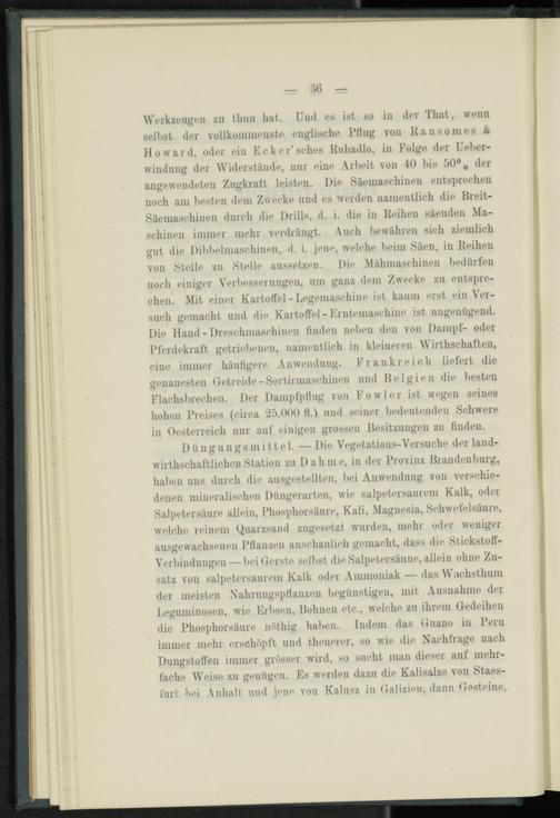 Werkzeugen zu tun liat. Und es ist so in der Th.it, wenn selbst der vollkommenste englische Pflug von Kan so nies & Howard, oder ein Ecker’sches Rukadlo, in Folge der Ueber- windung der Widerstände, nur eine Arbeit von 40 bis 50° 0 der angewendeten Zugkraft leisten. Die Säemaschinen entsprechen noch am besten dem Zwecke und es werden namentlich die Breit- Säemaschinen durch die Drills, d. i. die in Reihen säenden Maschinen immer mehr verdrängt. Auch bewähren sich ziemlich gut die Dibbelmaschinen, d. i. jene, welche beim Säen, in Reihen von Stelle zu Stelle aussetzen. Die Mähmaschinen bedürfen noch einiger Verbesserungen, um ganz dem Zwecke zu entsprechen. Mit einer Kartoffel - Eegemaschine ist kaum erst ein Versuch gemacht und die Kartoffel - Erntemaschine ist ungenügend. Die Hand-Dreschmaschinen finden neben den von Dampf- oder Pferdekraft getriebenen, namentlich in kleineren Wirtschaften, eine immer häutigere Anwendung. Frankreich liefert die genauesten Getreide-Sortirmaschinen und Belgien die besten Flachsbrechen. Der Dampfptiug von Fowler ist wegen seines hohen Preises (circa 25.000 tb) und seiner bedeutenden Schwere in Oesterreich nur auf einigen grossen Besitzungen zu finden.