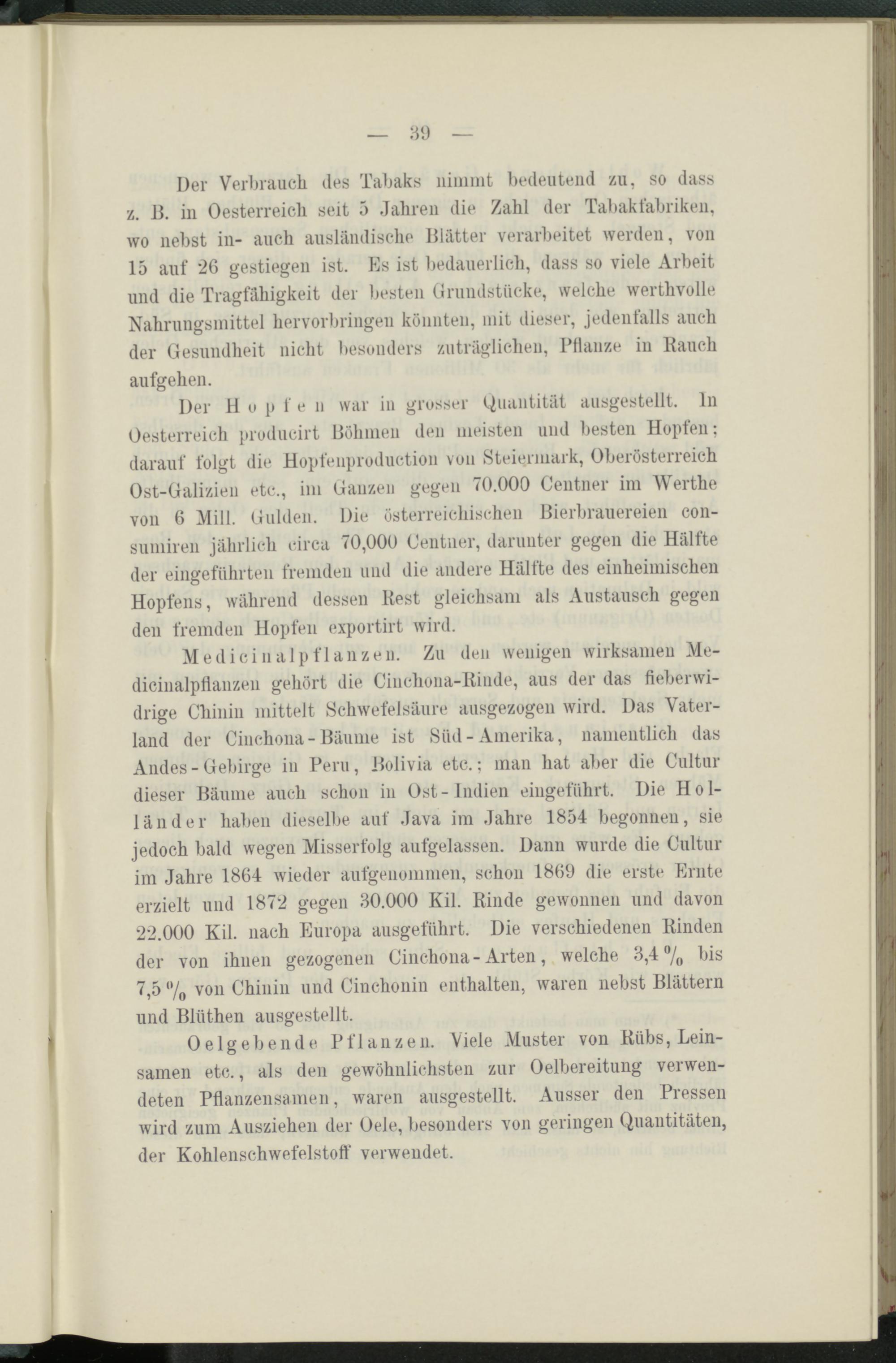 Der H o p f e n war in grosser Quantität ausgestellt, ln Oesterreich producirt Böhmen den meisten und besten Hopfen: darauf folgt die Hopfenproduction von Steiermark, Oberösterreich Ost-Galizien etc., im Ganzen gegen 70.000 Centner im Werthe von 6 Mill. Gulden. Die österreichischen Bierbrauereien con- sumiren jährlich circa 70,000 Centner, darunter gegen die Hälfte der eingeführten fremden und die andere Hälfte des einheimischen Hopfens, während dessen Rest gleichsam als Austausch gegen den fremden Hopfen exportirt wird.
