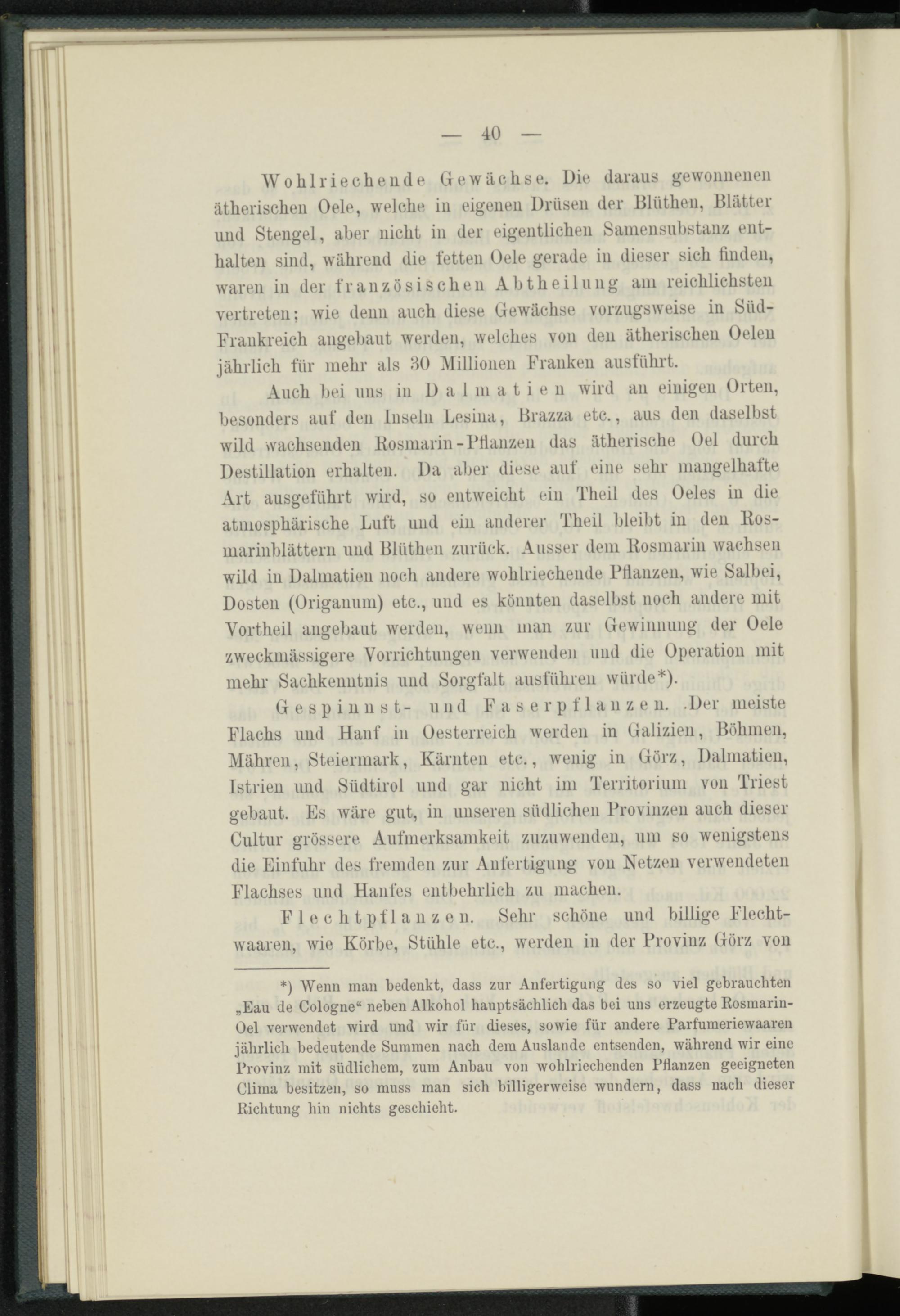 *) Wenn man bedenkt, dass zur Anfertigung des so viel gebrauchten „Eau de Cologne“ neben Alkohol hauptsächlich das bei uns erzeugte Rosmarin- Gel verwendet wird und wir für dieses, sowie für andere Parfüraeriewaaren jährlich bedeutende Summen nach dem Auslande entsenden, während wir eine Provinz mit südlichem, zum Anbau von wohlriechenden Pflanzen geeigneten Cliraa besitzen, so muss man sich billigerweise wundern, dass nach dieser Richtung hin nichts geschieht.