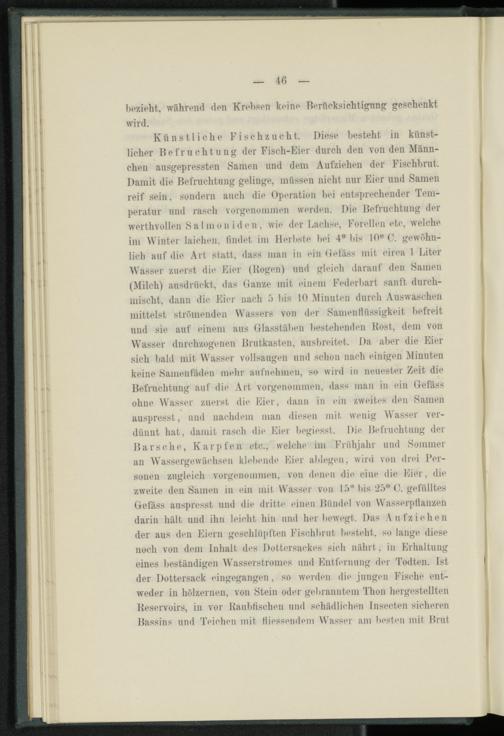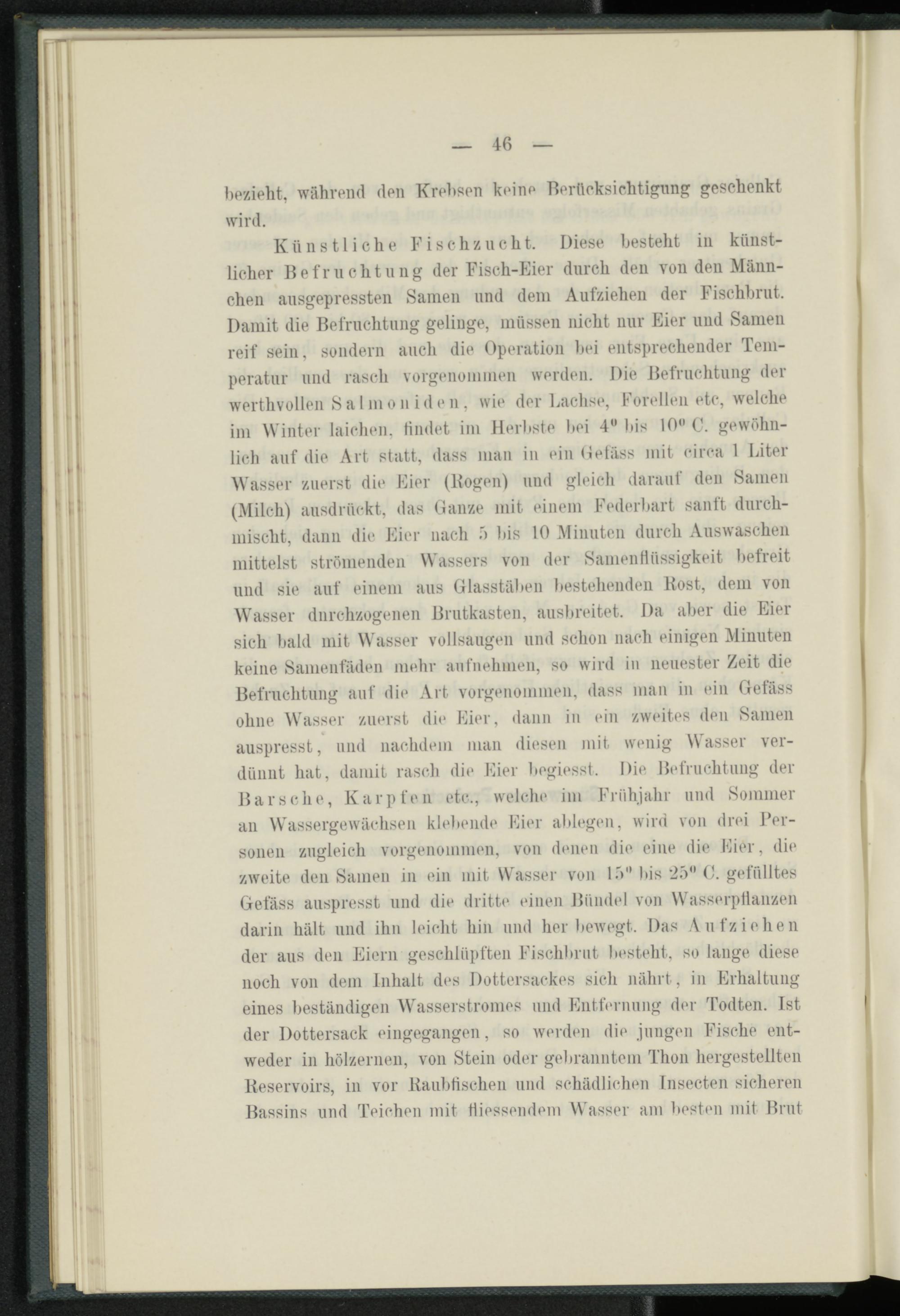 Künstliche Fischzucht. Diese besteht in künstlicher Befruchtung der Fisch-Eier durch den von den Männchen ausgepressten Samen und dem Aufziehen der Fischbrut. Damit die Befruchtung gelinge, müssen nicht nur Eier und Samen reif sein, sondern auch die Operation bei entsprechender Temperatur und rasch vorgenommen werden. Die Befruchtung der werthvollen S a I m o n i d e n , wie der Lachse, Forellen etc, welche im Winter laichen, findet im Herbste bei 4 W bis 10" C. gewöhnlich auf die Art statt, dass man in ein Oetäss mit circa 1 Liter Wasser zuerst die Eier (Bogen) und gleich darauf den Samen (Milch) ausdrückt, das Ganze mit einem Federbart sanft durchmischt, dann die Eier nach b bis 10 Minuten durch Auswaschen mittelst strömenden Wassers von der SamenHüssigkeit befreit und sie auf einem aus Glasstäben bestehenden Kost, dem von Wasser durchzogenen Brutkasten, ausbreitet. Da aber die Eier sich bald mit Wasser vollsaugen und schon nach einigen Minuten keine Samenfäden mehr aufnehmen, so wird in neuester Zeit die Befruchtung auf die Art vorgenommen, dass man in ein Gefäss ohne Wasser zuerst die Eier, dann in ein zweites den Samen auspresst, und nachdem man diesen mit wenig Wasser verdünnt hat, damit rasch di«* Eier begiesst. Die B«*fruchtung der Barsche, Karpfen etc., welche im Frühjahr und Sommer an Wassergewächsen klebende Eier ablegen, wird von drei Personen zugleich vorgenommen, von denen die eine die Eier, die zweite den Samen in ein mit Wasser von lb" bis 25° 0. gefülltes Gefäss auspresst und die dritte einen Bündel von Wasserpflanzen darin hält und ihn leicht hin und her bewegt. Das Aufziehen der aus den Eiern geschlüpften Fischbrut besteht, so lange diese noch von dem Inhalt dt*s Dottersackes sich nährt, in Erhaltung eines beständigen Wasserstromes und Entfernung der Todten. Ist der Dottersack eingegangen, so werden die jungen Fische entweder in hölzernen, von Stein oder gebranntem Thon hergestellten Reservoirs, in vor Kaubfischen und schädlichen Insecten sicheren Bassins und Teichen mit Messendem Wasser am besten mit Brut