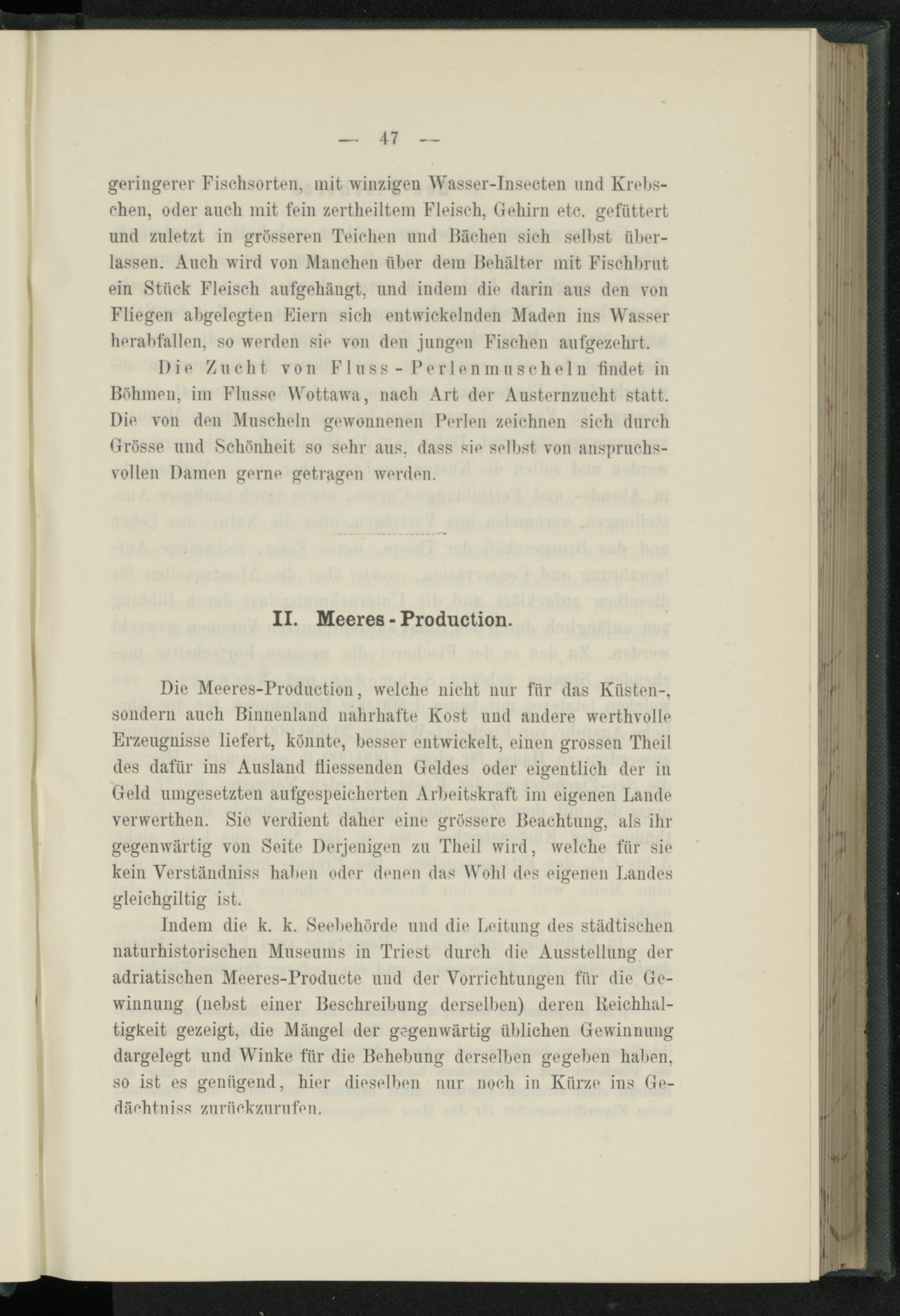 Indem die k. k. Seebehörde und die Leitung des städtischen naturhistorischen Museums in Triest durch die Ausstellung der adriatischen Meeres-Producte und der Vorrichtungen für die Gewinnung (nebst einer Beschreibung derselben) deren Reichhaltigkeit gezeigt, die Mängel der gegenwärtig üblichen Gewinnung dargelegt und Winke für die Behebung derselben gegeben hatten, so ist es genügend, hier dieselben nur noch in Kürze ins Ge- dächtniss zurückzurufen.