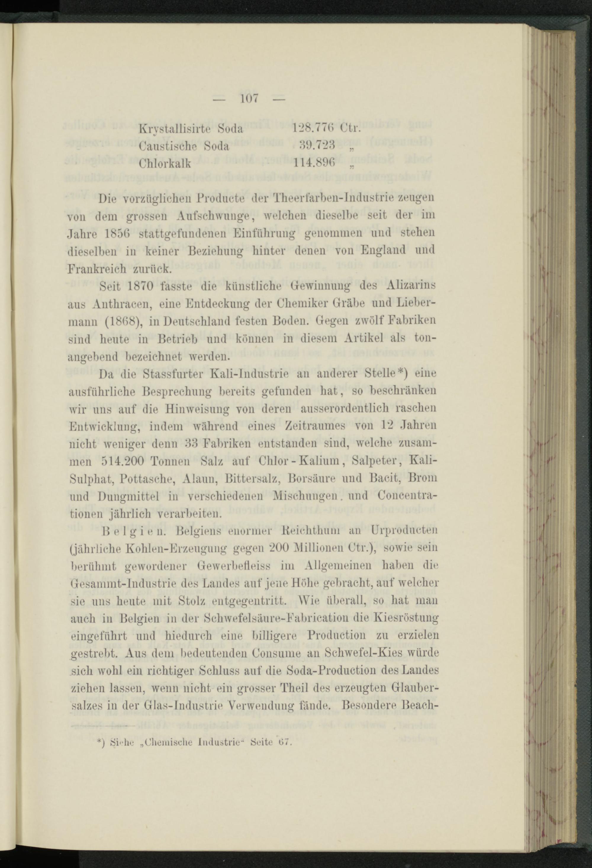 B e 1 g i e n. Belgiens enormer Keichtlnmi an Urproducten (jährliche Kohlen-Erzeugung gegen 200 Millionen Ctr.), sowie sein berühmt gewordener Gewerbefleiss im Allgemeinen haben die Gesammt-Industrie des Landes auf jene Höhe gebracht, auf welcher sie uns heute mit Stolz entgegentritt. Wie überall, so hat man auch in Belgien in der Schwefelsäure-Fabrication die Kiesröstung eingeführt und hiedurch eine billigere Production zu erzielen gestrebt. Aus dem bedeutenden Consume an Schwefel-Kies würde sich wohl ein richtiger Schluss auf die Soda-Production des Landes ziehen lassen, wenn nicht ein grosser Theil des erzeugten Glaubersalzes in der Glas-Industrie Verwendung fände. Besondere Beacli-