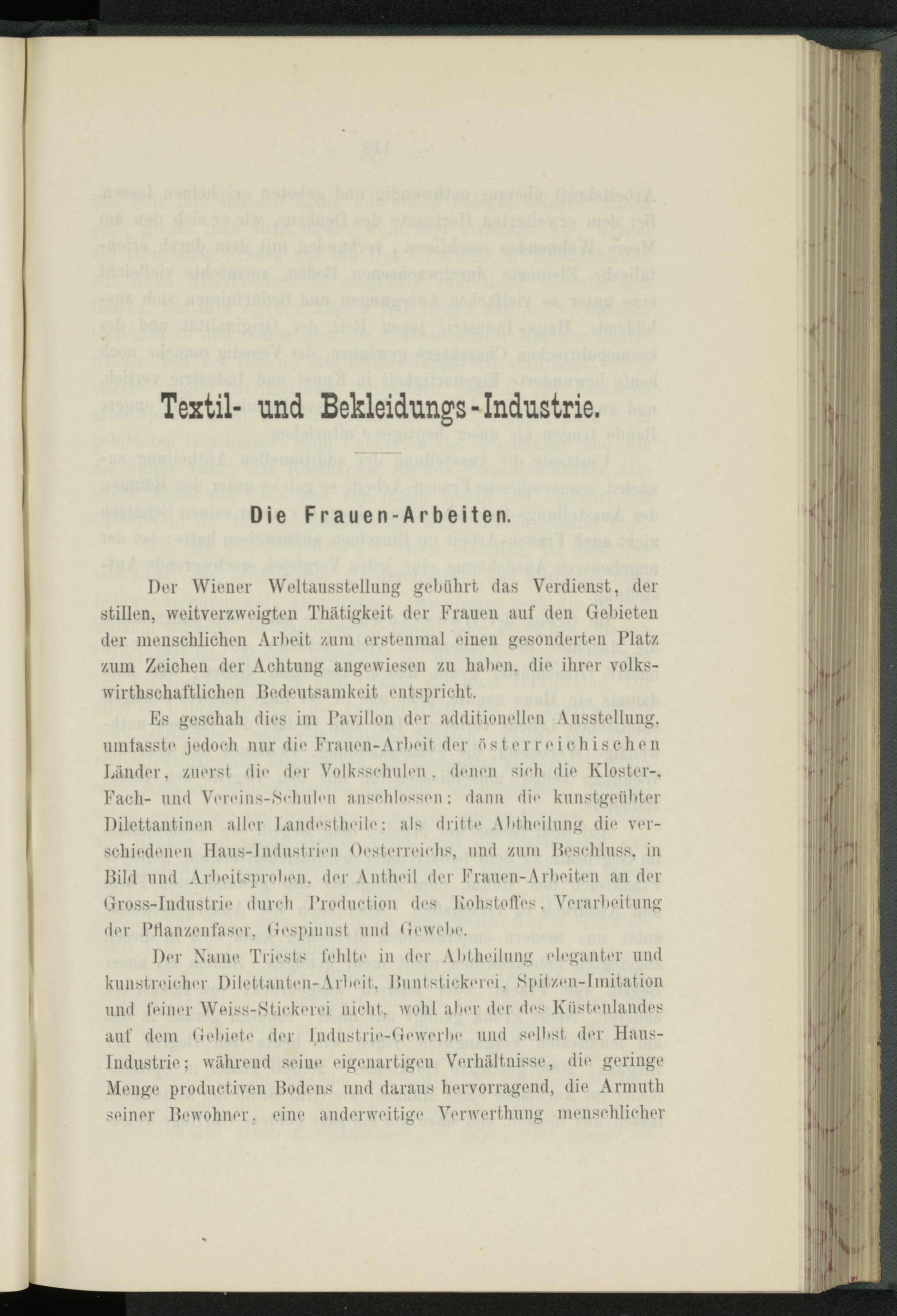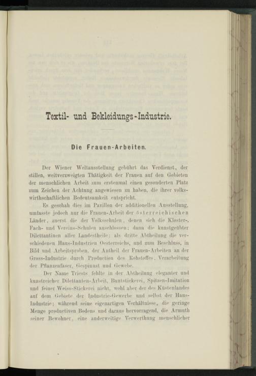 Der Name Triests fehlte in der Abteilung eleganter und kunstreicher Dilettanten-Arbeit, Buntstickerei, Spitzen-Imitation und feiner Weiss-Stickerei nicht, wohl aber der des Küstenlandes auf dem Gebiete der Industrie-Gewerbe und selbst der Hausindustrie; während seine eigenartigen Verhältnisse, die geringe Menge productiven Bodens und daraus hervorragend, die Armut seiner Bewohner, eine anderweitige Verwertung menschlicher