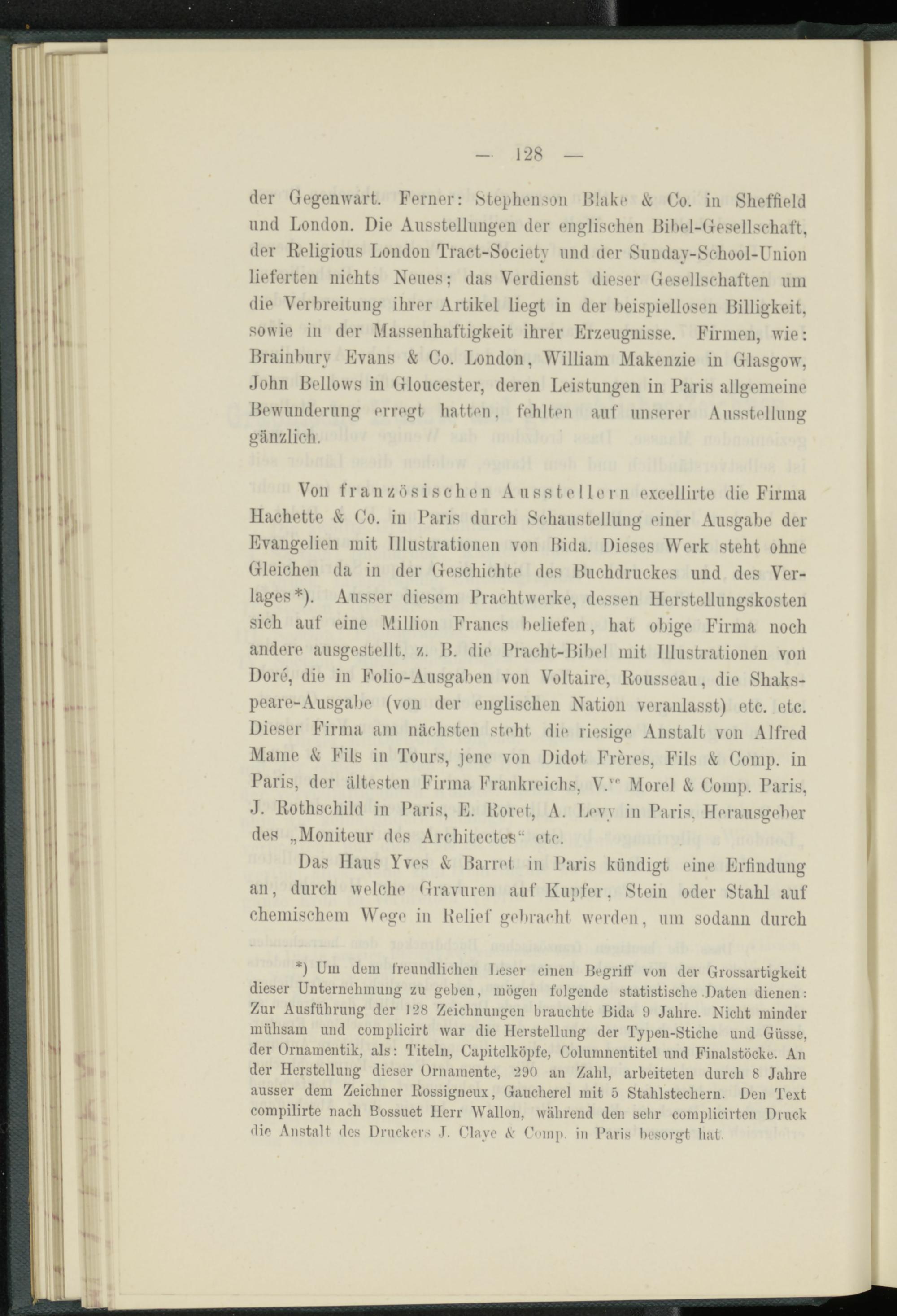 Von französischen Ausstellern excellirte die Firma Hachette & Co. in Paris durch Schaustellung einer Ausgabe der Evangelien mit Illustrationen von Bida. Dieses Werk steht ohne Gleichen da in der Geschichte dos Buchdruckes und des Verlages*). Ausser diesem Prachtwerke, dessen Herstellungskosten sich auf eine Million Francs beliefen, hat obige Firma noch andere ausgestellt, z. B. die Pracht-Bibel mit Illustrationen von Dore, die in Folio-Ausgaben von Voltaire, Rousseau, die Shaks- peare-Ausgabe (von der englischen Nation veranlasst) etc. etc. Dieser Firma am nächsten steht die riesige Anstalt von Alfred Manie & Fils in Tours, jene von Didot Freres, Fils & Comp, in Paris, der ältesten Firma Frankreichs, V. vr Morel & Comp. Paris, J. Rothschild in Paris, E. Köret, A. Lew in Paris. Herausgeber des „Moniteur des Arohiteetes“ etc.