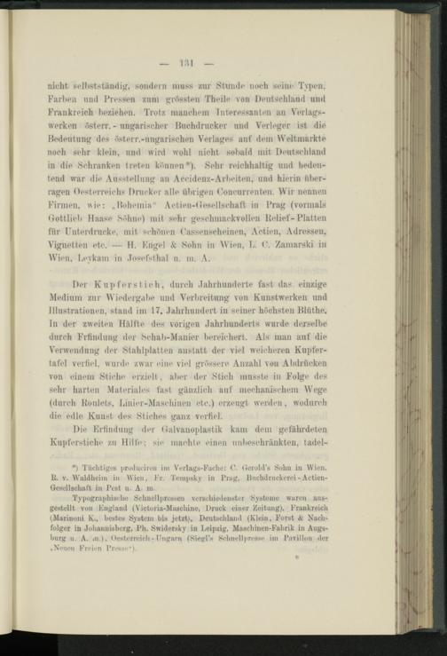 nicht selbstständig, sondern muss zur Stunde noch seine Typen, Farben und Fressen zum grössten Theile von Deutschland und Frankreich beziehen. Trotz manchem Interessanten au Verlagswerken flsterr. - ungarischer Huchdrucker und Verleger ist die Bedeutung des fisterr.-ungarischen Verlages auf dem Weltmärkte noch sehr klein, und wird wohl nicht sobald mit Deutschland in die »Schranken treten können*). »Sehr reichhaltig und bedeutend war die Ausstellung an Accidenz-Arbeiten, und hierin überragen Oesterreichs Drucker alle übrigen (Joncurrenten. Wir nennen Firmen, nie: „Bohemia“ Actien-Oesellsohaft in Frag (vormals flottlieb Haase Söhne) mit sehr geschmackvollen Relief-Flatten für Unterdrücke, mit schönen ('assenscheinen, Actien, Adressen, Vignetten etc. — H. Kugel & »Sohn in Wien, E. Zamarski in Wien. Keykam in .losefsthal u. m. A.