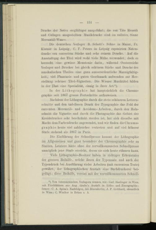 Die deutschen Verleger B. Sehott’s Söhne in Mainz, Fr. Kistner in Leipzig, 0. F. Peters iu Leipzig exponirteu Notendrücke von correcteni Stiche und sehr reinem Drucke. Auf die Ausstattung der Titel wird wohl viele Mühe verwendet, docli es herrscht eine gewisse Monotonie darin, während Oesterreichs Verleger und Drucker bei gleich schönem Stiche und Drucke des musikalischen Theiles eine ganz ausserordentliche Mannigfaltigkeit, viel Phantasie und guten Geschmack aufwenden zur Herstellung schöner Titel-Vignetten. Die Wiener Musiktitel bilden in der That eine Speeialität, einzig in ihrer Art*).