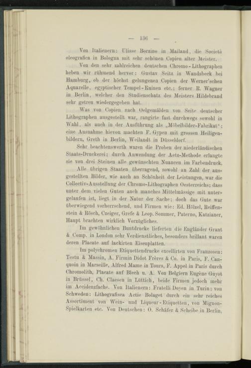 Im polychromen Etiquettendrucke excellirten von Franzosen: Testu & Massin, A. Finnin Didot Freies & Co. in Paris, F. Cau- quoin in Marseille, Alfred Marne in Tours, F. Appel in Paris durch Chromolith, Placate auf Blech u. A. Von Belgiern Eugene Guyot in Brüssel, Ch. Claesen in Lüttich, beide Firmen jedoch mehr im Accidenzfache. Von Italienern: Fratelli Doyen in Turin; von Schweden: Lithogratisca Actie Bolaget durch ein sehr reiches Assortiment von Wein- und Liqueur-Etiquetten, von Mignon- Spielkarten etc. Von Deutschen: 0. Schäfer & Scheibe in Berlin,