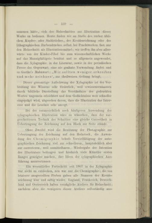 nommen hätte, sich des Holzschnittes zur Illustration dieser Werke zu bedienen. Heute linden wir an Stelle des vorher üblichen Kupfer- oder Stahlstiches, der Kreidezeichnung oder des lithographischen Farbendruckes selbst bei Frachtwerken fast nur den Holzschnitt als Illustrationsniittel; wir treffen ihn aber aller- wärts von der Kinder-Fibel bis zum wissenschaftlichen Werke auf das Mannigfaltigste benützt und so allgemein angewendet, dass die Xylographie in der Literatur, sowie in der periodischen Fresse der Gegenwart eine nie geahnte Verwendung bildet und so Goethe’s Mahnwort: „Wir sollten weniger schreiben und mehr zeichnen“, zur theilweisen Geltung bringt.