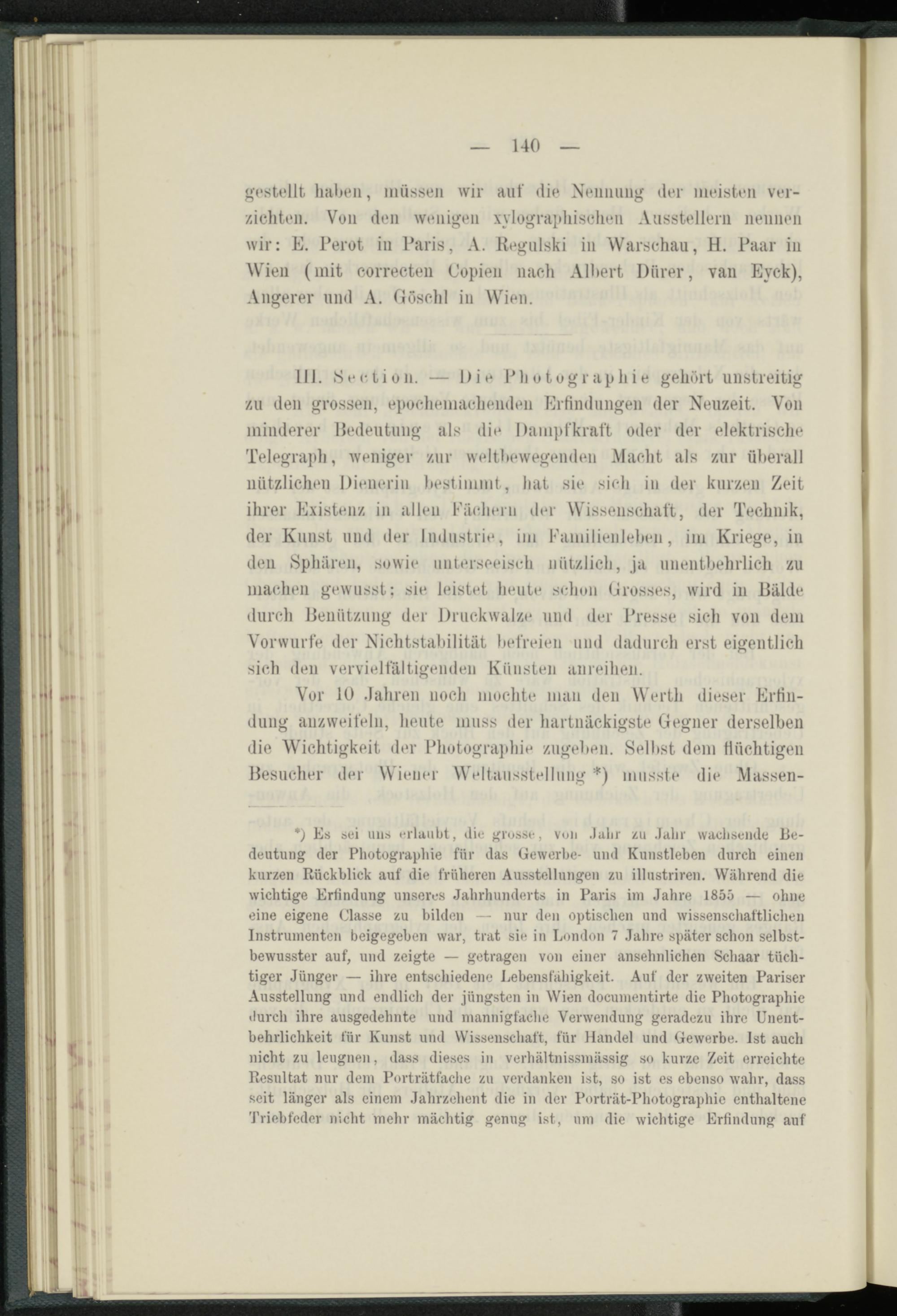 III. Seetiun. — Die Pliutugraphie gehört unstreitig zu den grossen, epochemachenden Erfindungen der Neuzeit. Von minderer lfedeutung als die Dampfkraft oder der elektrische Telegraph, weniger zur weltbewegenden Macht als zur überall nützlichen Dienerin bestimmt, hat sie sich in der kurzen Zeit ihrer Existenz in allen Fächern der Wissenschaft, der Technik, der Kunst und der Industrie, im Familienleben, im Kriege, in den .Sphären, sowie unterseeisch nützlich, ja unentbehrlich zu machen gewusst: sie leistet heute schon Grosses, wird in Eälde durch IJeniitzung der Druckwalze und der Presse sich von dem Vorwurfe der Nichtstabilität befreien und dadurch erst eigentlich sich den vervielfältigenden Künsten anreihen.