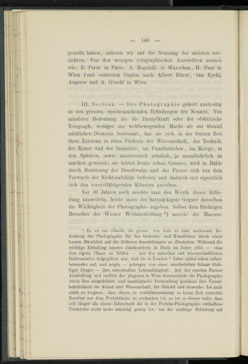 Vor 10 .Jahren noch mochte mau den Werth dieser Erfindung anzweifeln, heute muss der hartnäckigste Gegner derselben die Wichtigkeit der Photographie zugelten. Selbst dem flüchtigen Hesucher der Wiener Weltausstellung *) musste die Massen-