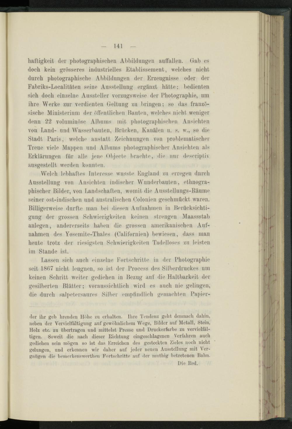 Welch lebhaftes Interesse wusste. England zu erregen durch Ausstellung von Ansichten indischer Wunderbauten, ethnographischer Milder, von Landschaften, womit die Ausstellungs-Bäume seiner ost-indischen und australischen Oolonien geschmückt waren. Billigerweise durfte man bei diesen Aufnahmen in Merücksichti- gung der grossen Schwierigkeiten keinen strengen Maassstab anlegen, andererseits haben die grossen amerikanischen Aufnahmen des Yosemite-Thales (Californien) bewiesen, dass man heute trotz der riesigsten Schwierigkeiten Tadelloses zu husten im Stande ist.