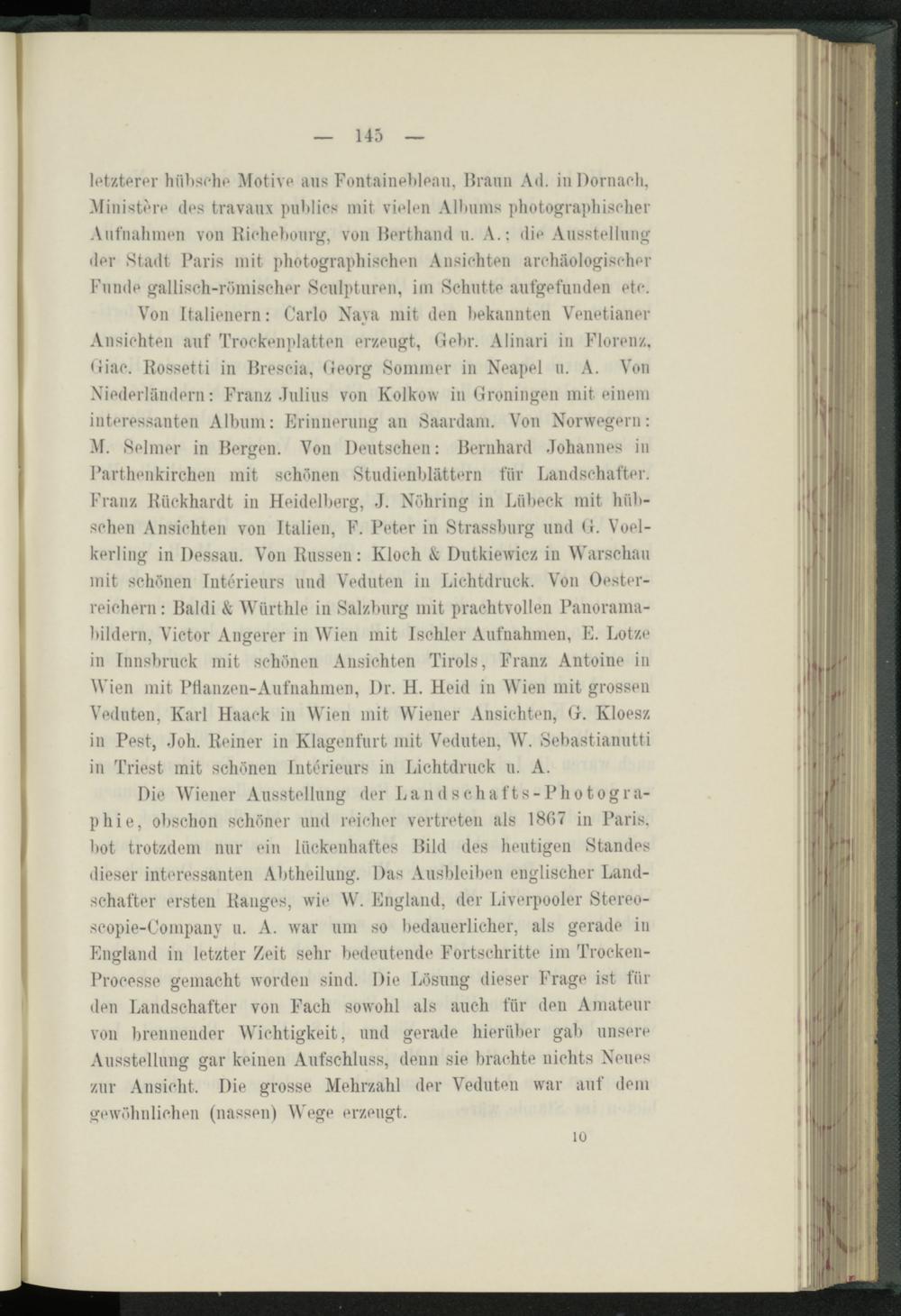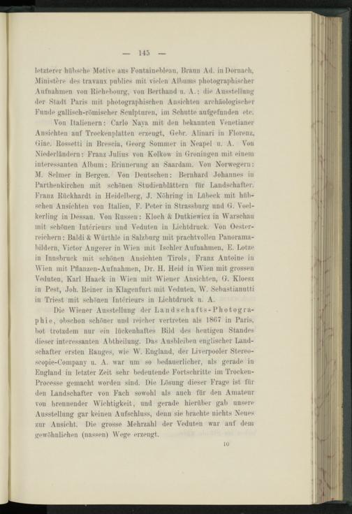 Von I talienern: Carlo Xaya mit den bekannten Venetianer Ansichten auf Trockenplatten erzeugt, Gehr. Alinari in Florenz. Giae. Kossetti in Brescia, Georg Sommer in Neapel u. A. Von Niederländern: Franz Julius von Kolkow in Groningen mit einem interessanten Album: Erinnerung an Saardam. Von Norwegern: M. Selmer in Bergen. Von Deutschen: Bernhard Johannes in Parthenkirclien mit schönen Studienblättern für Landschafter. Franz Bückhardt in Heidelberg, J. Nöhring in Lübeck mit hübschen Ansichten von Italien, F. Peter in Strassburg und G. Voel- kerling in Dessau. Von Russen: Kloch & Dutkiewicz in Warschau mit schönen Interieurs und Veduten in Lichtdruck. Von Oesterreichern : Baldi & Wiirthle in Salzburg mit prachtvollen Panoramabildern, Victor Angerer in Wien mit Ischler Aufnahmen, E. Lotze in Innsbruck mit schönen Ansichten Tirols, Franz Antoine in Wien mit Pflanzen-Aufnahmen, Dr. H. Heid in Wien mit grossen Veduten, Karl Haaek in Wien mit Wiener Ansichten, G. Kloesz in Pest, Joh. Reiner in Klagenfurt mit Veduten, W. Sebastianutti in Triest mit schönen Interieurs in Lichtdruck u. A.