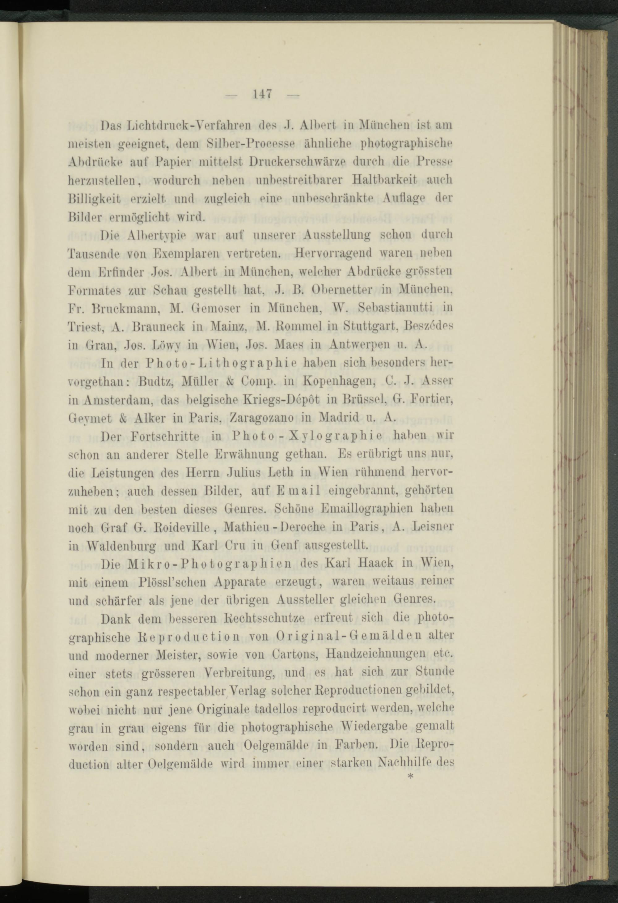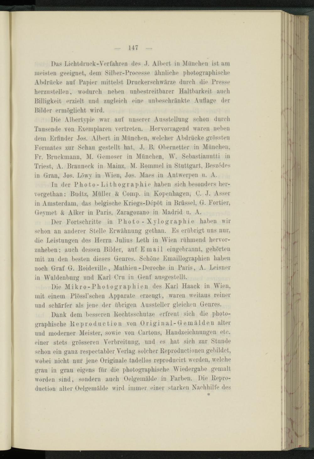 Die Albertypie war auf unserer Ausstellung schon durch Tausende von Exemplaren vertreten. Hervorragend waren neben dem Erfinder Jos. Albert in München, welcher Abdrücke grössten Formates zur »Schau gestellt hat, J. B. Obernetter in München, Fr. Bruckmann, M. Gemoser in München, W. »Sebastianutti in Triest, A. Brauneck in Mainz, M. Rommel in »Stuttgart, Beszedos in Gran, Jos. Löwv in Wien, Jos. Maes in Antwerpen u. A.
