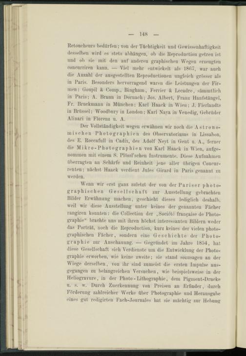 Der Vollständigkeit wegen erwähnen wir noch die Astronomischen Photographien des Observatoriums in Lissabon, dps E. Koccafull in Cadix, des Adolf Neyt in Gent u. A., ferner die Mikro-Photographien von Karl Haack in Wien, aufgenommen mit einem 8. Plössl’schen Instrumente. Diese Aufnahmen überragten an Schärfe und Reinheit jene aller übrigen Coneur- renten; nächst Haack verdient Jules Girant in Paris genannt zu werden.
