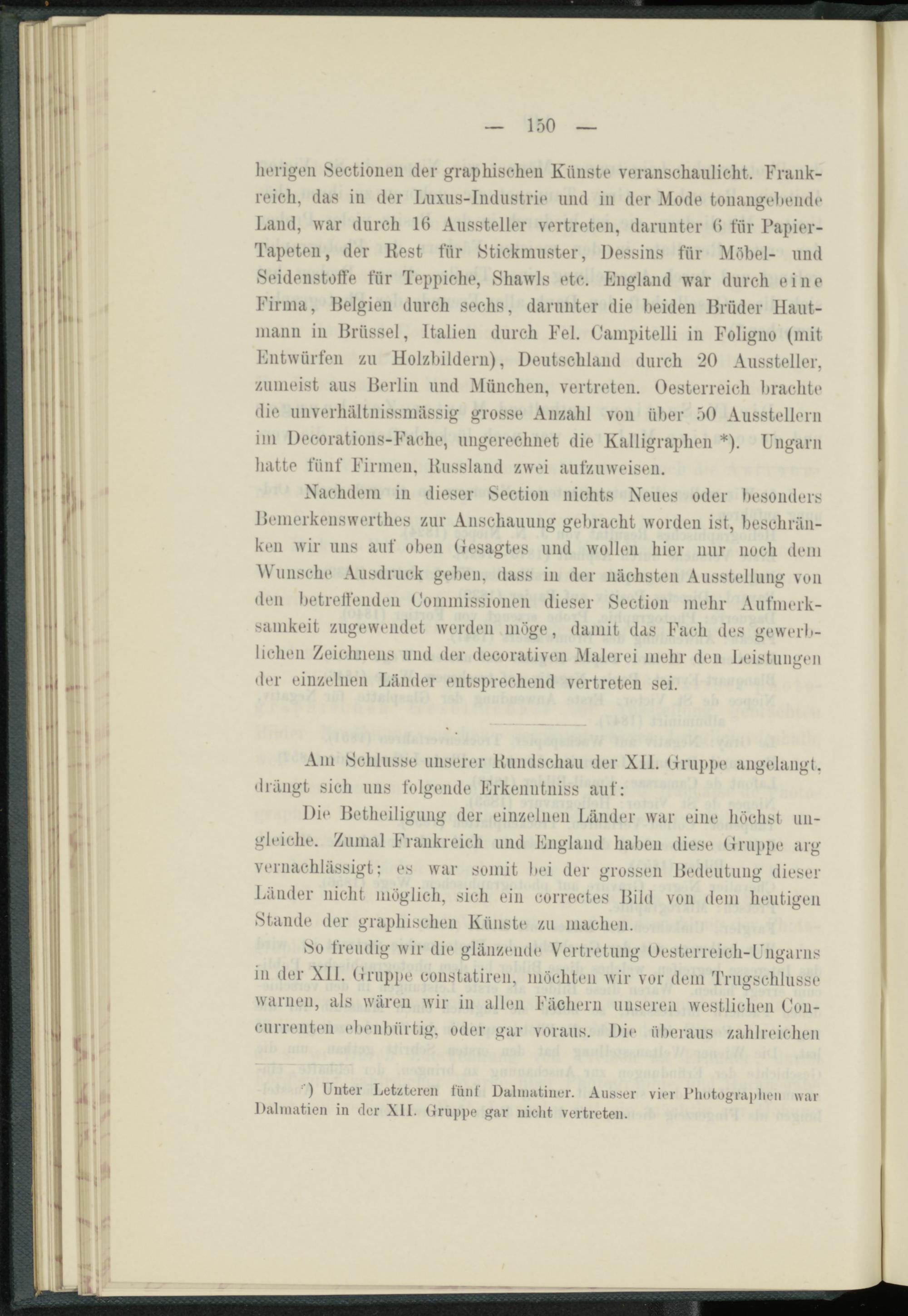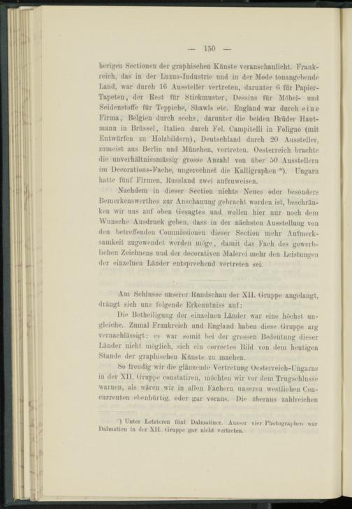 So freudig wir die glänzende Vertretung Oesterreich-Ungarns in der XII. Gruppe constatiren, möchten wir vor dem Trugschlüsse warnen, als wären wir in allen Fächern unseren westlichen Con- currenten ebenbürtig, oder gar voraus. Die überaus zahlreichen