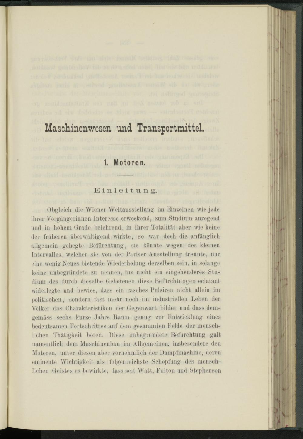 Obgleich die Wiener Weltausstellung im Einzelnen wie jede ihrer Vorgängerinnen Interesse erweckend, zum Studium anregend und in hohem Orade belehrend, in ihrer Totalität aber wie keine der früheren überwältigend wirkte, so war doch die anfänglich allgemein gehegte Befürchtung, sie könnte wegen des kleinen Intervalles, welcher sie von der Pariser Ausstellung trennte, nur eine wenig Neues bietende Wiederholung derselben sein, in solange keine unbegründete zu nennen, bis nicht ein eingehenderes Studium des durch dieselbe Oeboteiien diese Befürchtungen eclatant widerlegte und bewies, dass ein rasches Pulsiren nicht allein im politischen, sondern fast mehr noch im industriellen Leben der Völker das Charakteristiken der 0egenwart bildet und dass demgemäss sechs kurze Jahre Kaum genug zur Entwicklung eines bedeutsamen Fortschrittes auf dem gesummten Felde der menschlichen Thätigkeit boten. Diese unbegründete Befürchtung galt namentlich dem Maschinenbau im Allgemeinen, insbesondere den Motoren, unter diesen aber vornehmlich der Dampfmaehine, deren eminente Wichtigkeit als folgenreichste Schöpfung des menschlichen (leistes es bewirkte, dass seit Watt, Fulton und Stephensoii