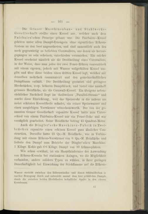 Die G r a z e r Maschinenbau- und Stahlwcrks- Gosellsohaft stellte einen Kessel aus, welcher nach dem Fai rbairn’schon Principe gebaut war. Die Fairbairn - Kessel gehören unter allen Dampf-Erzeugern ohne eigentliches Köhren- System zu den best angeordneten, und sind namentlich auch den noch gegenwärtig so beliebten Oornwallern, aus denen sie hervorgegangen zu sein scheinen, entschieden vorzuziehen. Ein solcher Kessel erscheint nämlich als die Dreitheilung eines Cornwallers, in der Weise, dass man jedes der zwei Feuer-Köhren concentrisch mit einem eigenen, jedoch mit Wasser vollgeffiIlten Kessel umgibt und über diese beiden einen dritten Kessel legt, welcher mit denselben mehrfach communicirt und den gemeinschaftlichen Dampfraum enthält. Die Dreitheilung gestattet viel geringere Klechstärken, resp. höheren Dampfdruck, und bietet eine namhaft grössere Heizfläche, als die Cornwall-Kessel. Ein übrigens nebensächlicher Nachtheil liegt im theilweisen „Parallel-Strome“ und macht diese Einrichtung, weil das Speiserohr in die nahezu am meist erhitzten Kesseltheile mündet, ein reines Speisewasser und einen ausgiebigen Vorwärmer wünschenswerte Der von der genannten Grazer Gesellschaft exponirte Kessel hatte zum Unterschied von einem Fairbairn-Kessel nur ein Feuer-Kohr und war vorzüglich gearbeitet. Seine Heizfläche betrug 45 Quadrat-Meter.