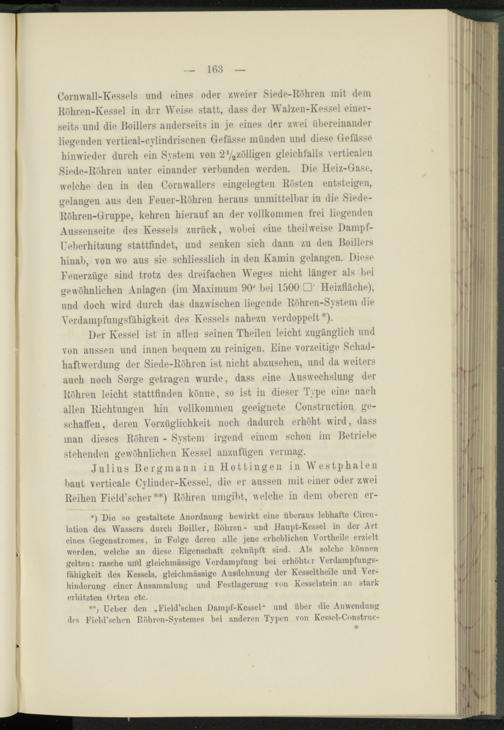 Ju 1 ius Be rgmann in Hottingen in Westpha 1 en baut verticale Cylinder-Kessel, die er aussen mit einer oder zwei Reihen Field’scher **) Röhren umgibt, welche in dem oberen er-
