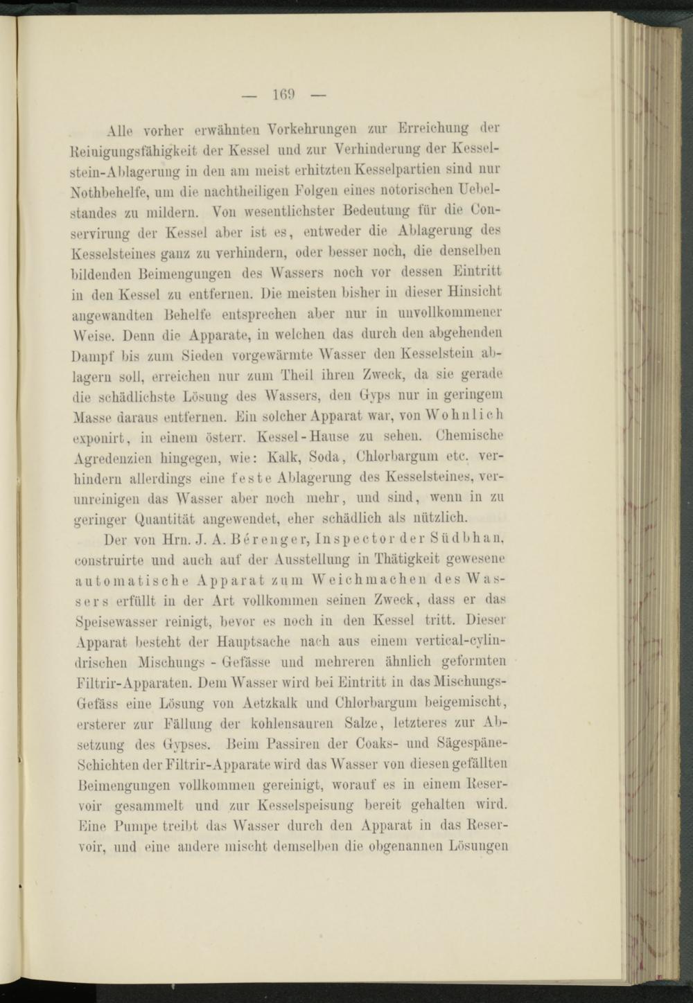 Der von Hrn. J. A. B e r e n g e r, 1 n s p e c t o r d e r Süd b h a n. construirte und auch auf der Ausstellung in Thätigkeit gewesene automatische Apparat z u in W e i c h in a c h e n des W a s- sers erfüllt in der Art vollkommen seinen Zweck, dass er das Speisewasser reinigt, bevor es noch in den Kessel tritt. Dieser Apparat besteht der Hauptsache nach aus einem vertical-cvlin- drischen Mischlings - Gefässe und mehreren ähnlich geformten Filtrir-Apparaten. Dem Wasser wird bei Eintritt in das Mischungs- Gefäss eine Lösung von Aetzkalk und Chlorbargum beigemiseht, ersterer zur Fällung der kohlensauren Salze, letzteres zur Absetzung des Gypses. Beim Passireu der Coaks- und Sägespäne- Sckichten der Filtrir-Apparate wird das Wasser von diesen gefällten Heimengungen vollkommen gereinigt, worauf es in einem Keser- voir gesammelt und zur Kesselspeisung bereit gehalten wird. Eine Pumpe treibt das Wasser durch den Apparat in das Reservoir, und eine andere mischt demselben die obgenannen Lösungen