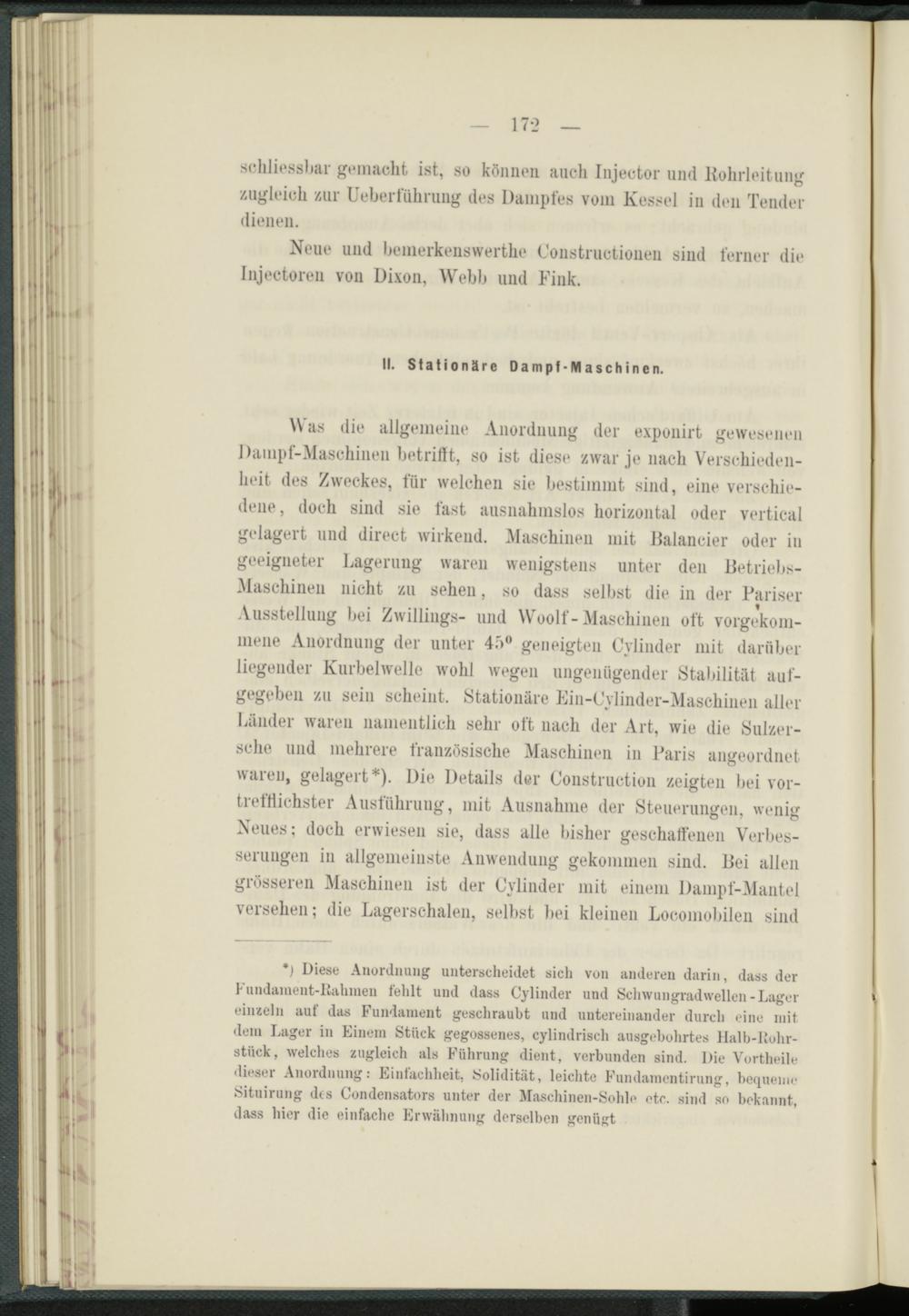 Was die allgemeine Anordnung der exponirt gewesenen Dampf-Maschinen betrifft, so ist diese zwar je nach Verschiedenheit des Zweckes, für welchen sie bestimmt sind, eine verschiedene , doch sind sie fast ausnahmslos horizontal oder vertieal gelagert und direct wirkend. Maschinen mit Balancier oder in geeigneter Lagerung waren wenigstens unter den Betriebs- Maschinen nicht zu sehen, so dass selbst die in der Pariser