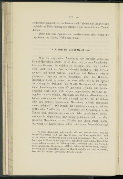 Ausstellung bei Zwillings- und Woolf-Maschinen oft vorgekom- mene Anordnung der unter 4f>° geneigten Oylinder mit darüber liegender Kurbelwelle wohl wegen ungenügender Stabilität aufgegeben zu sein scheint. Stationäre Fin-Oylinder-Maschinen aller Länder waren namentlich sehr oft nach der Art, wie die Sulzer- sche und mehrere französische Maschinen in Paris angeordnet waren, gelagert*). Die Details der Construction zeigten bei vortrefflichster Ausführung, mit Ausnahme der Steuerungen, wenig Neues; doch erwiesen sie, dass alle bisher geschaffenen Verbesserungen in allgemeinste Anwendung gekommen sind. Bei allen grösseren Maschinen ist der Ovlinder mit einem Dampf-Mantel versehen; die Lagerschalen, selbst bei kleinen Locomobilen sind