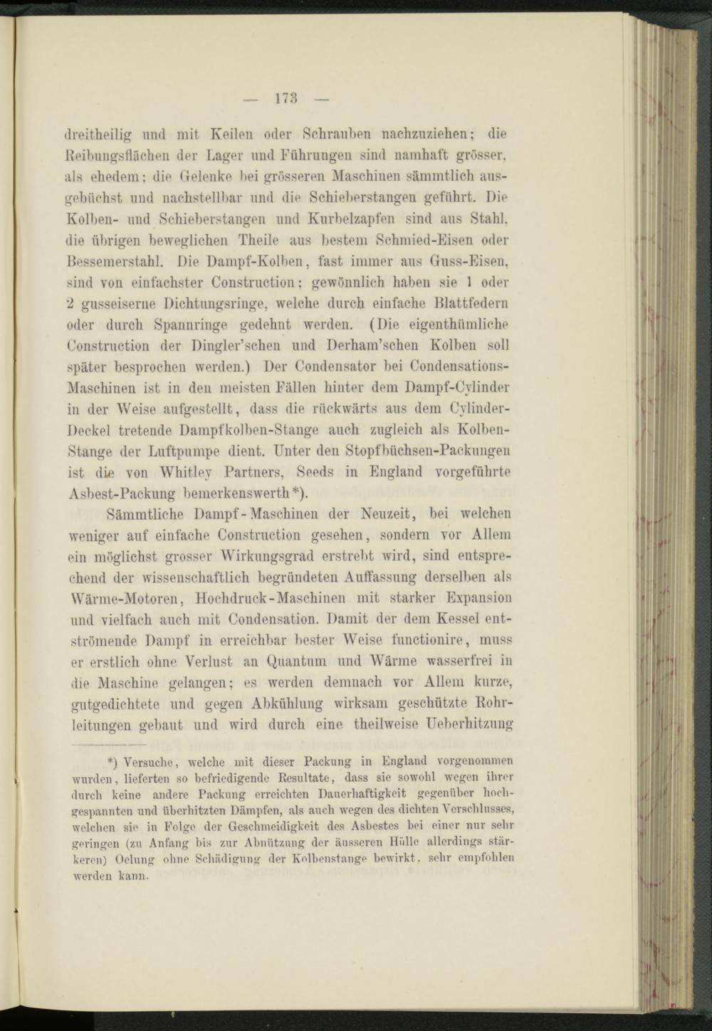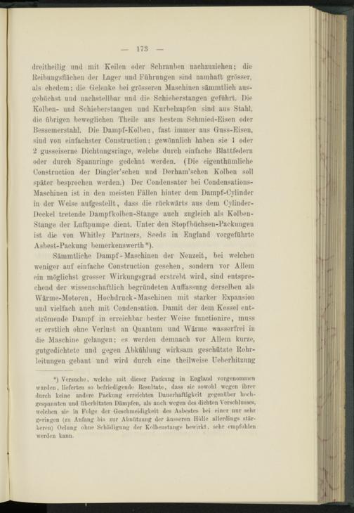 dreitheilig und mit Keilen oder Sehrauhen nachzuziehen; die Rcibuugsflächcn der Lager und Führungen sind namhaft grösser, als ehedem: die Gelenke hei grösseren Maschinen sämmtlich aus- gehiiehst und naclistellhar und die Schieherstangen geführt. Die Kolhen- und Schieherstangen und Kurhelzapfen sind aus Stahl, die übrigen beweglichen Theile aus bestem Schmied-Eisen oder Bessemerstahl. Die Dampf-Kolben, fast immer aus Guss-Eisen, sind von einfachster Construction: gewönnlich haben sie 1 oder 2 gusseiserne Dichtungsringe, welche durch einfache Blattfedern oder durch Spannringe gedehnt werden. (Die eigentümliche Construction der Dingler’schen und Derham’schen Kolben soll später besprochen werden.) Der Condensator bei Condensations- Maschinen ist in den meisten Fällen hinter dem Dampf-Cvlinder in der Weise aufgestellt, dass die rückwärts aus dem Cylinder- Deckel tretende Dampfkolben-Stange auch zugleich als Kolben- Stange der Luftpumpe dient. Unter den Stopfbüchsen-Packungen ist die von Whitlev Partners, Seeds in England vorgeführte Asbest-Packung bemerkenswert *).