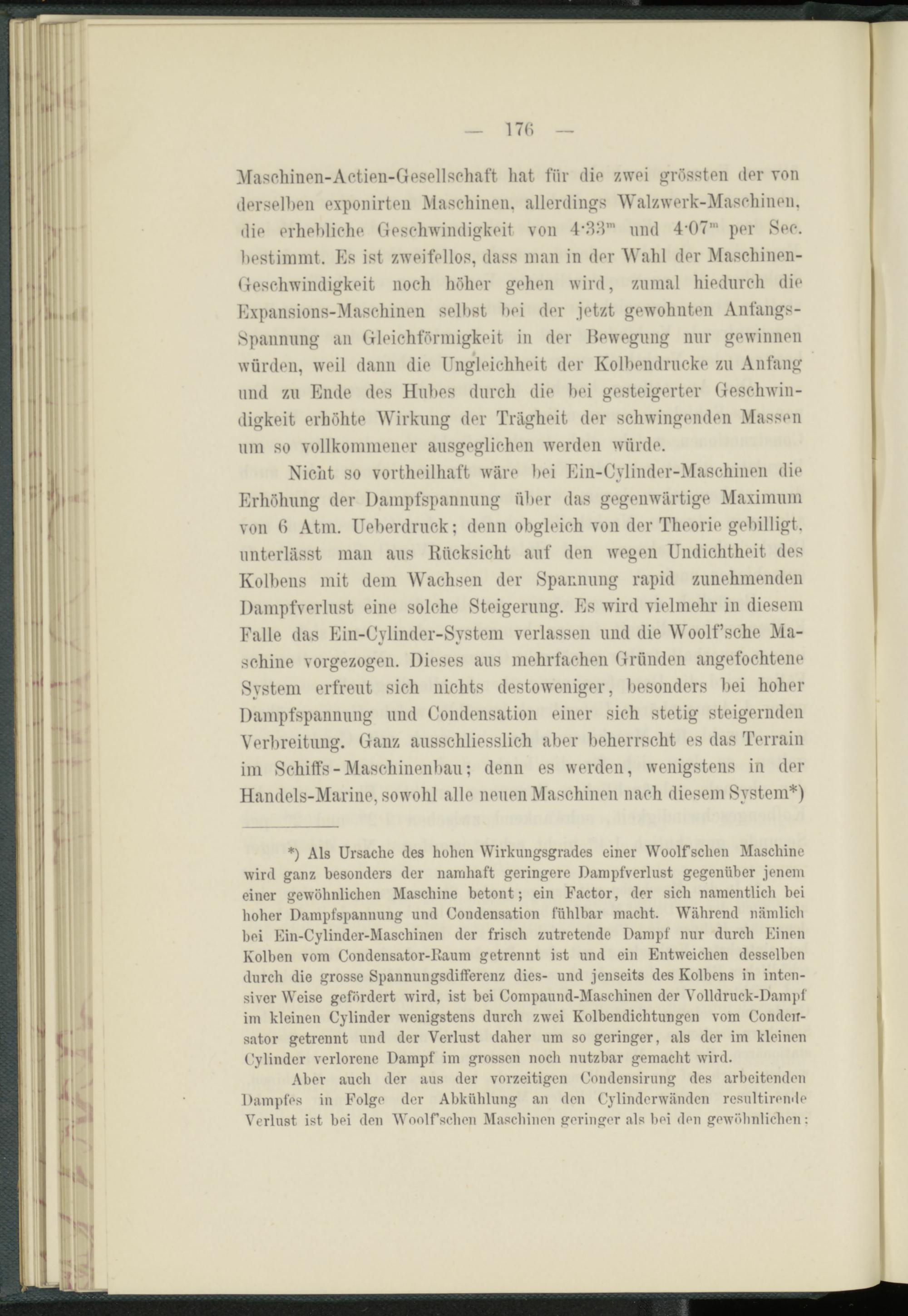 Nicht so vorteilhaft wäre bei Ein-Cylinder-Maschinen die Erhöhung der Dampfspannung über das gegenwärtige Maximum von 6 Atm. Ueberdruck; denn obgleich von der Theorie gebilligt, unterlässt man aus Rücksicht auf den wegen Undichtheit des Kolbens mit dem Wachsen der Spannung rapid zunehmenden Dampfverlust eine solche Steigerung. Es wird vielmehr in diesem Falle das Ein-Cylinder-Svstem verlassen und die Woolf sehe Maschine vorgezogen. Dieses aus mehrfachen Gründen angefochtene System erfreut sich nichts destoweniger, besonders bei hoher Dampfspannung und Condensation einer sich stetig steigernden Verbreitung. Ganz ausschliesslich aber beherrscht es das Terrain im Schilfs-Maschinenbau; denn es werden, wenigstens in der Handels-Marine, sowohl alle neuen Maschinen nach diesem System*)