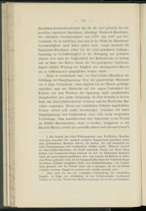 Maschinen-Actien-Gesellschaft hat für die zwei grössten der von derselben exponirten Maschinen, allerdings Walzwerk-Maschinen, die erhebliche Geschwindigkeit von 4'33 m und 4 , 07 m per Sec. bestimmt. Es ist zweifellos, dass man in der Wahl der Maschinen- Geschwindigkeit noch höher gehen wird, zumal hiedurch die Expansions-Maschinen selbst bei der jetzt gewohnten Anfangs- Spannung an Gleichförmigkeit in der Hewegung nur gewinnen würden, weil dann die Ungleichheit der Kolbendrucke zu Anfang und zu Ende des Hubes durch die bei gesteigerter Geschwindigkeit erhöhte Wirkung der Trägheit der schwingenden Massen um so vollkommener ausgeglichen werden würde.