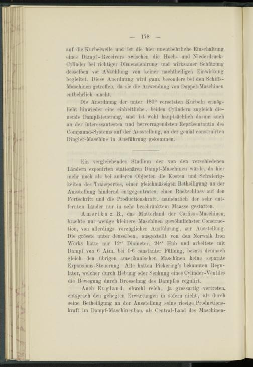 Ein vergleichendes Studium der von den verschiedenen Ländern exponirten stationären Dampf-Maschinen würde, da hier mehr noch als bei anderen Objecten die Kosten und Schwierigkeiten des Transportes, einer gleichmässigen Betheiligung an der Ausstellung hindernd entgegentraten, einen Rückschluss auf den Fortschritt und die Productionskraft, namentlich der sehr entfernten Länder nur in sehr beschränktem Maasse gestatten.