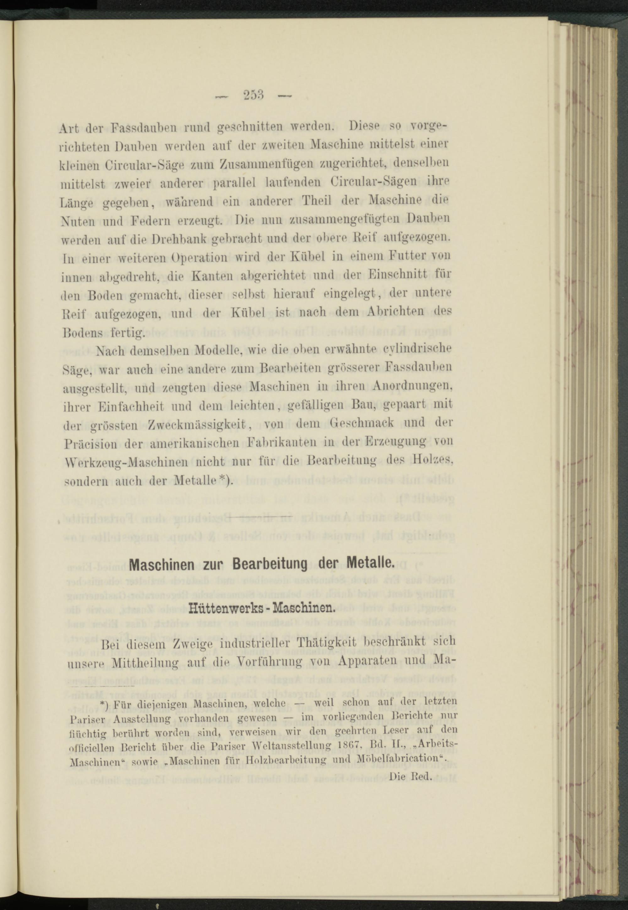 Nach demselben Modelle, wie die oben erwähnte cvlindrische Säge, war auch eine andere zum Bearbeiten grösserer Fassdauben ausgestellt, und zeugten diese Maschinen in ihren Anordnungen, ihrer Einfachheit und dem leichten, gefälligen Bau, gepaart mit der grössten Zweckmässigkeit, von dem Geschmack und der Präeision der amerikanischen Fabrikanten in der Erzeugung von Werkzeug-Maschinen nicht nur für die Bearbeitung des Holzes, sondern auch der Metalle*).