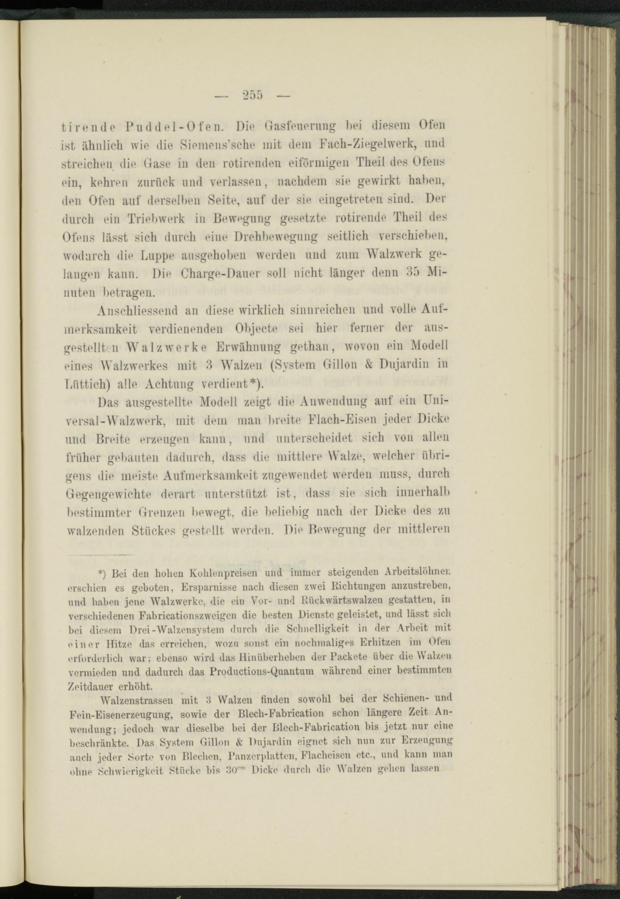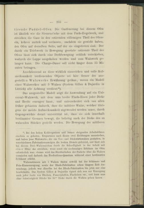 Anschliessend an diese wirklich sinnreichen und volle Aufmerksamkeit verdienenden Objecte sei hier ferner der ausgestellten Walzwerke Erwähnung gethan, wovon ein Modell eines Walzwerkes mit 3 Walzen (System 0i 1 Ion & Dujardin in Lüttich) alle Achtung verdient*).