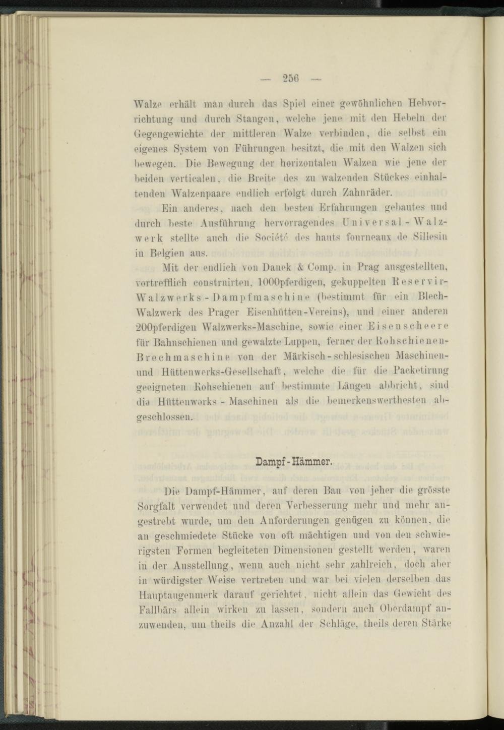 Mit der endlich von Danek & Comp, in Prag ausgestellten, vortrefflich eonstruirten, lOOOpferdigen, gekuppelten Beservir- Walzwerks - Dampfmaschine (bestimmt für ein Blech- Walzwerk des Prager Eisenhütten-Vereins), und einer anderen "iUOpferdigen Walzwerks-Maschine, sowie einer Eisens ch e e re für Bahnschienen und gewalzte Luppen, ferner der Bohschieneu- Breclnnaschi n e von der Märkisch-schlesischen Maschinen- und Hüttenwerks-Gesellschaft, welche die für die Paeketirung geeigneten Kohschieiien auf bestimmt«* Längen abbricht, sind dio Hüttenwerks - Maschinen als die bemerkenswerthesten abgeschlossen.