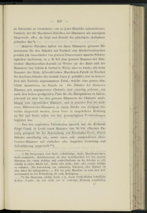 Von den englischen Fabrikanten speciell hat die Kirkstall Forge Comp, in Leeds einen Hammer von 50 Ctr. (Naylors Patent), geeignet für die Bearbeitung von Eisenbahn-Tyres, dessen Ständer zweitheilig ist, sowie einen sehr coinpendiösen Drei- Centner-Hammer mit einfacher oder doppelter Steuerung und Selbstführung ausgestellt **).