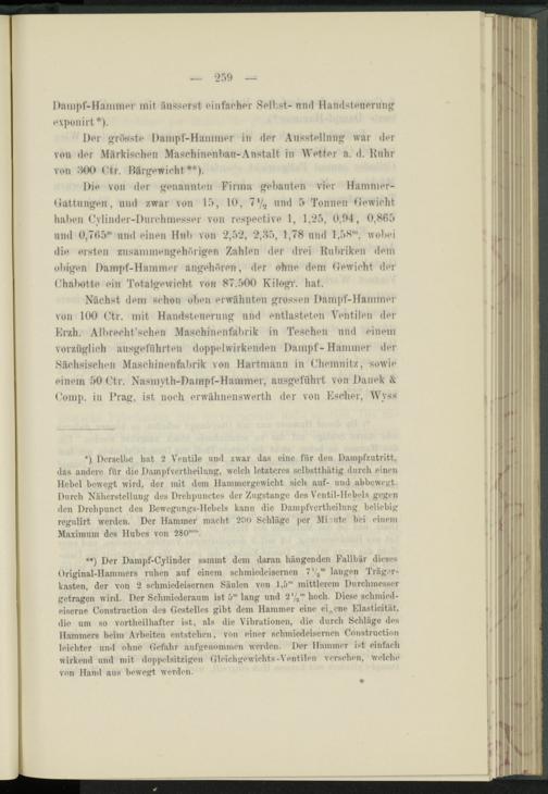 Nächst dem schon oben erwähnten grossen Dampf-Hammer von 100 Ctr. mit Handsteuerung und entlasteten Ventilen der Erzh. Albrecht’schen Maschinenfabrik in Teschen und einem vorzüglich ausgefiihrten doppelwirkenden Dampf-Hammer der Sächsischen Maschinenfabrik von Hartmann in Chemnitz, sowie einem 50 Ctr. Nasmyth-Dampf-Hammer, ausgeführt von Danek & Comp, in Prag, ist noch erwähnenswert!! der von Escher, Wvss