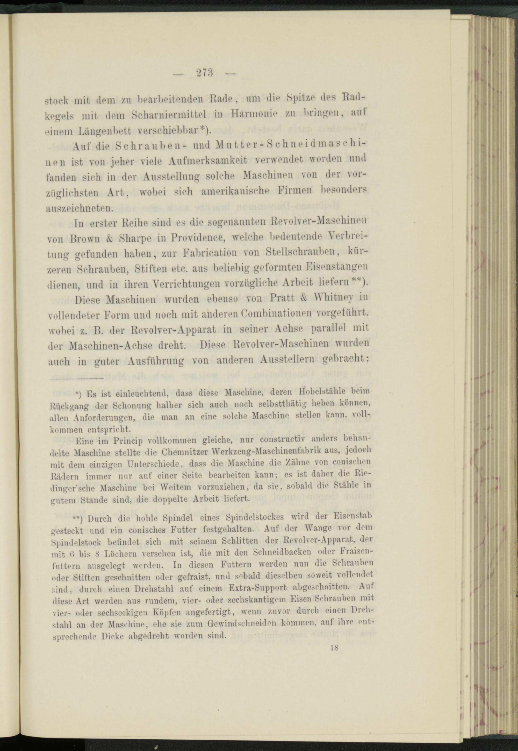 In erster Reihe sind es die sogenannten Revolver-Maschinen von Hrown & Sliarpe in Providence, welche bedeutende Verbreitung gefunden haben, zur Fabrication von Stellschrauben, kürzeren Schrauben, Stiften etc. aus beliebig geformten Fisenstangeu dienen, und in ihren Verrichtungen vorzügliche Arbeit liefern**).