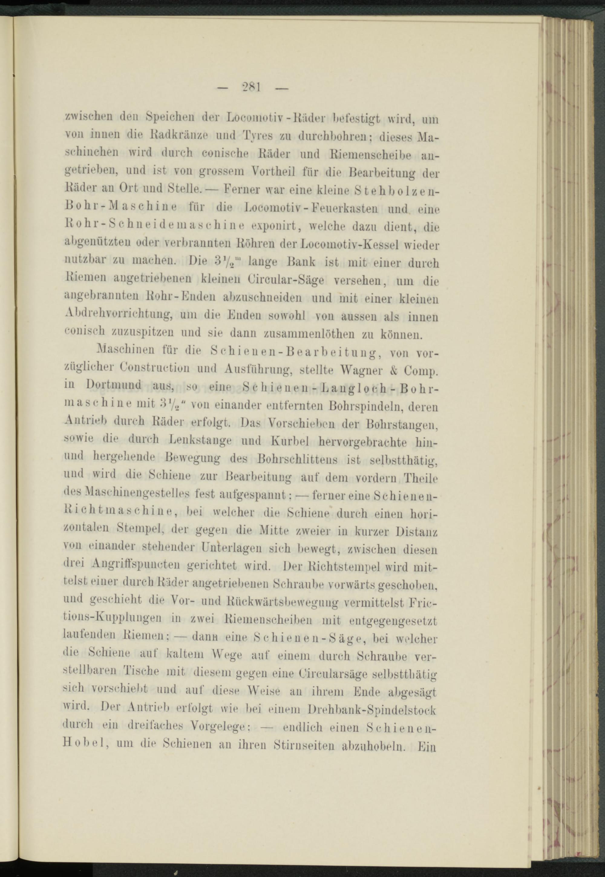 Maschinen für die S c h i e n e n - B e a r b e i t u n g, von vorzüglicher Constructiun und Ausführung, stellte Wagner & Comp, in Dortmund aus, so eine Schienen - Laug loch - Bohrmaschine mit M 1 /./' von einander entfernten Bohrspindeln, deren Antrieb durch Kader erfolgt. Das Vorschielten der Bohrstangen, sowie die durch Lenkstange und Kurbel hervorgebrachte hin- und hergehende Bewegung des Bohrschlittens ist seibstthätig, und wird die Schiene zur Bearbeitung auf dem vordem Tlieile des Maschinengestelles fest aufgespannt: — ferner eine Schienen- Kichtmaschine, bei welcher die Schiene* durch einen horizontalen Stempel, der gegen die Mitte zweier in kurzer Distanz von einander stehender Unterlagen sich bewegt, zwischen diesen drei Angritfspuncten gerichtet wird. Der Kichtstempel wird mittelst einer durch Kader angetriebeiien Schraube vorwärts geschoben, und geschieht die Vor- und Kückwärtsbewegung vermittelst Fric- tions-Kupplungen in zwei Kiemenscheiben mit entgegengesetzt laufenden Kiemen: — dann eine S cliieu e n-S äge, bei welcher die Schiene auf kaltem Wege auf einem durch Schraube verstellbaren Tische mit diesem gegen eine Circularsäge seibstthätig sich vorschiebt und auf diese Weise an ihrem Ende abgesägt wird. Der Antrieb erfolgt wie bei einem Drehbank-Spindelstock durch ein dreifaches Vorgelege: — endlich einen Sc hielte n- Hobel, um die Schienen an ihren Stirnseiten abzuhobeln. Ein