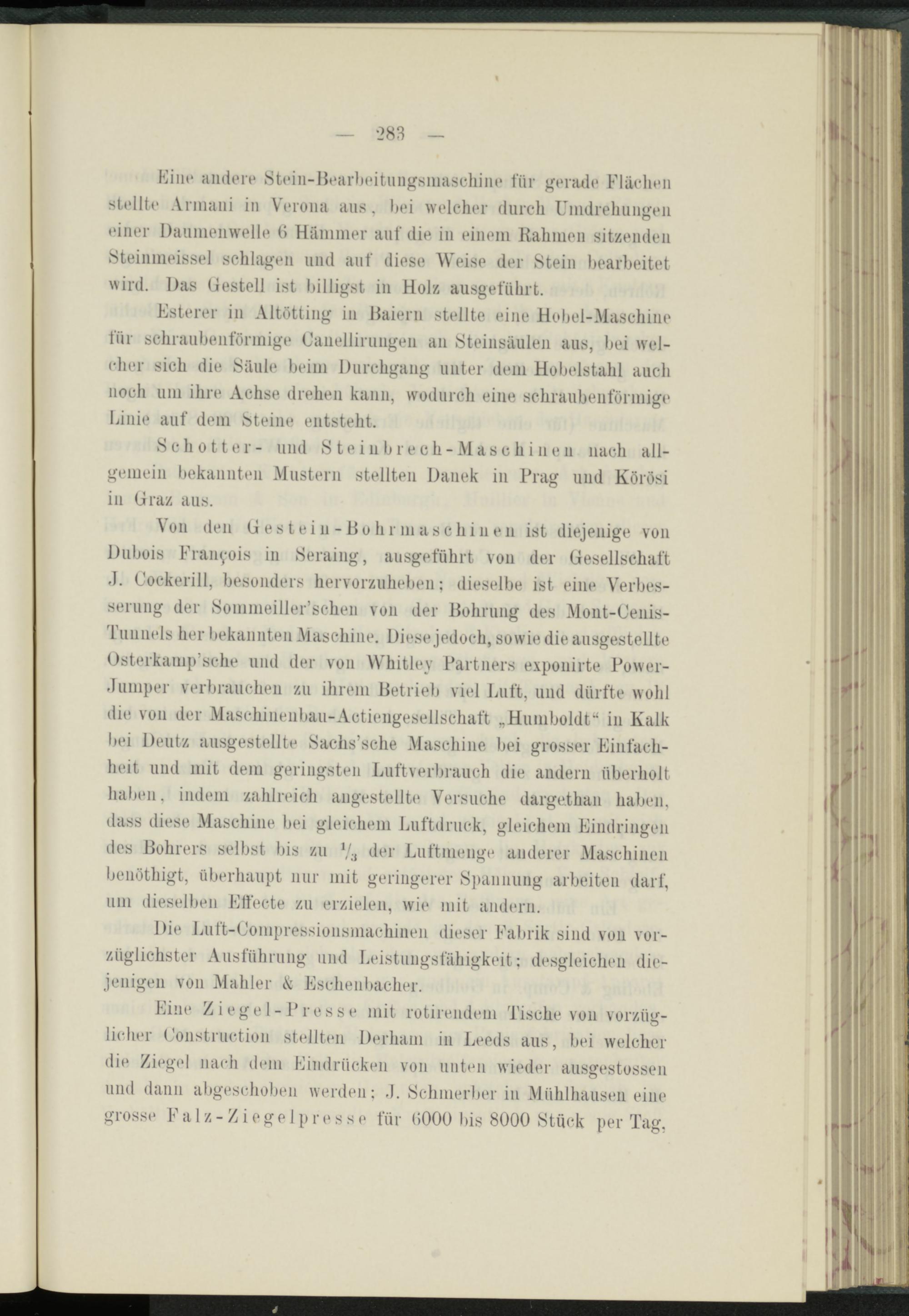 Esterer in Altötting in Baiern stellte eine Hobel-Maschine für schraubenförmige Uauellirungen an Steinsäulen aus, bei welcher sich die Säule beim Durchgang unter dem Hobelstahl auch noch um ihre Achse drehen kann, wodurch eine schraubenförmige Linie auf dem Steine entsteht.