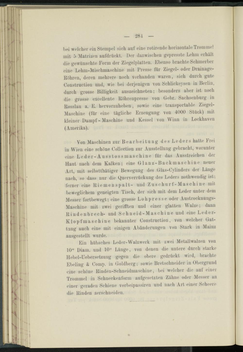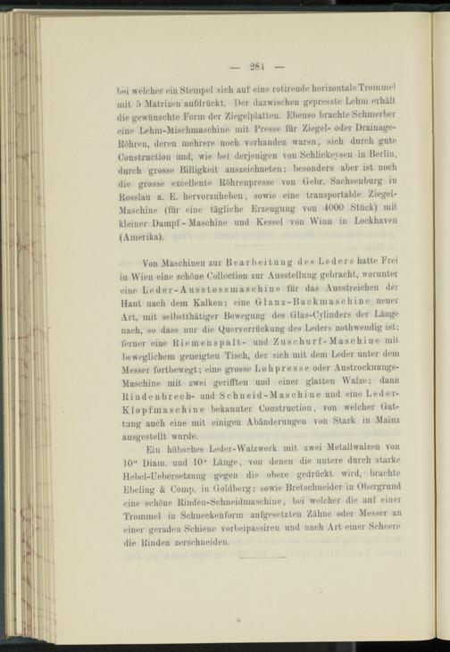 bei welcher ein Stempel sich auf eine rotirende horizontale Trommel mit f) Matrizen aufdrückt. Der dazwischen gepresste Lehm erhält die gewünschte Form der Ziegelplatteii. Ebenso brachte Schmerber eine Lehm-Mischmaschine mit Fresse für Ziegel- oder Drainage- ltöhren, deren mehrere noch vorhanden waren, sich durch gute Construction und, wie bei derjenigen von Schlickeysen in Berlin, durch grosse Billigkeit auszeichneten; besonders aber ist noch die grosse excellente Köhrenpresse von Gebr. Sachsenburg in Küsslau a. E. hervorzuheben, sowie eine transportable Ziegel- Maschine (für eine tägliche Erzeugung von 4000 Stück) mit kleiner Dampf - Maschine uud Kessel von Winn in Lockhaven (Amerika).