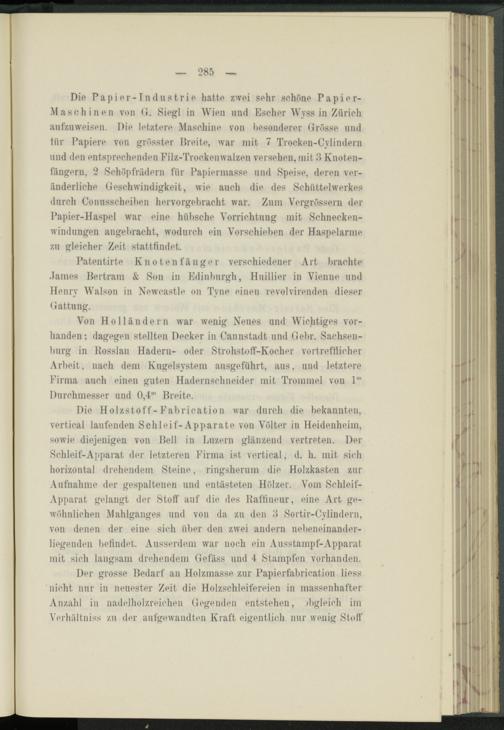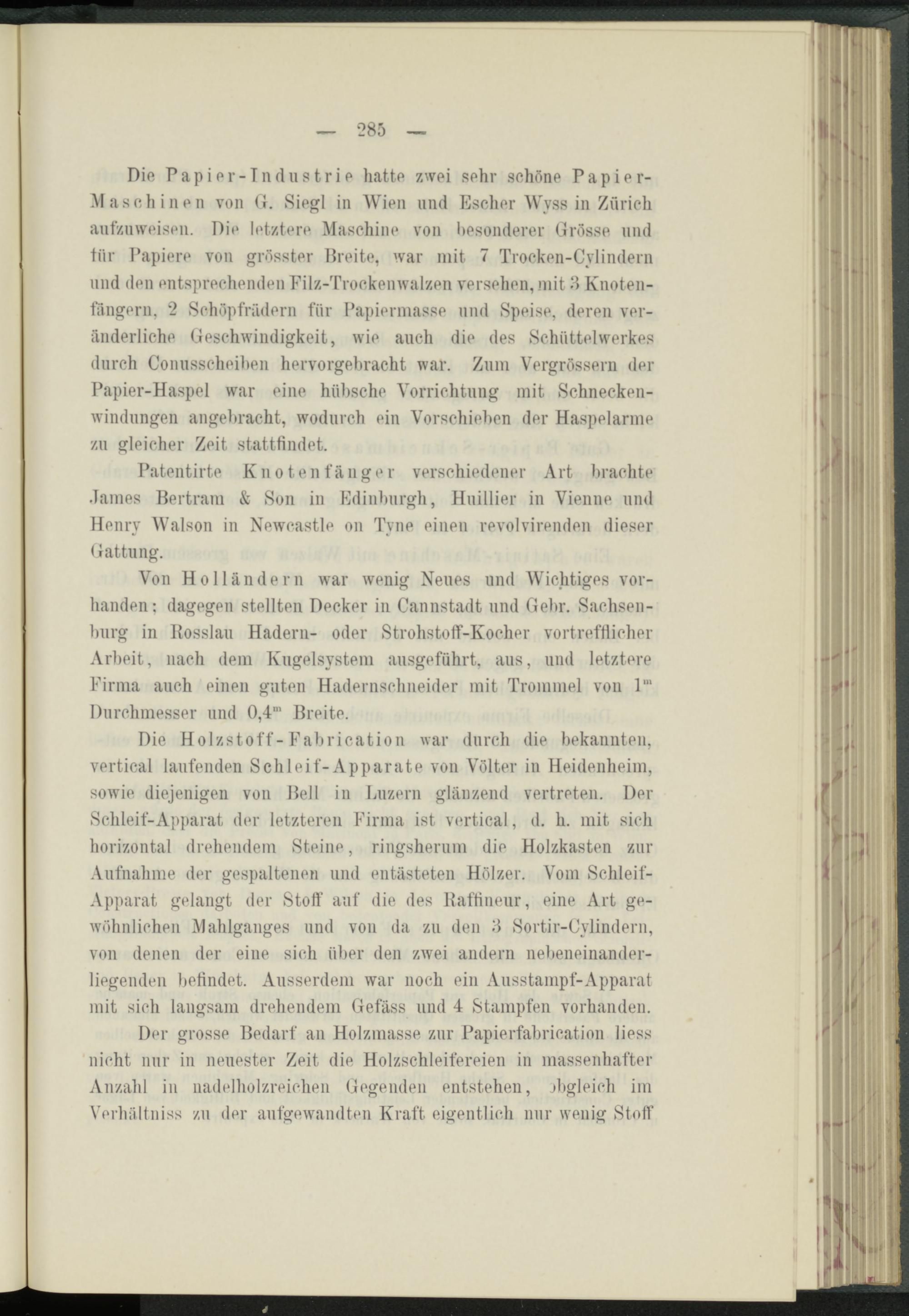 Die Holzstoff-Fabrication war durch die bekannten, vertical laufenden Schleif-Apparate von Völter in Heidenheim, sowie diejenigen von Bell in Luzern glänzend vertreten. Der Schleif-Apparat der letzteren Firma ist vertical, d. h. mit sich horizontal drehendem Steine, ringsherum die Holzkasten zur Aufnahme der gespaltenen und entästeten Hölzer. Vom Schleif- Apparat gelangt der Stoff auf die des Raffineur, eine Art gewöhnlichen Mahlganges und von da zu den 8 Sortir-Cvlindern, von denen der eine sich über den zwei andern nebeneinanderliegenden befindet. Ausserdem war noch ein Ausstampf-Apparat mit sich langsam drehendem Gefäss und 4 Stampfen vorhanden.