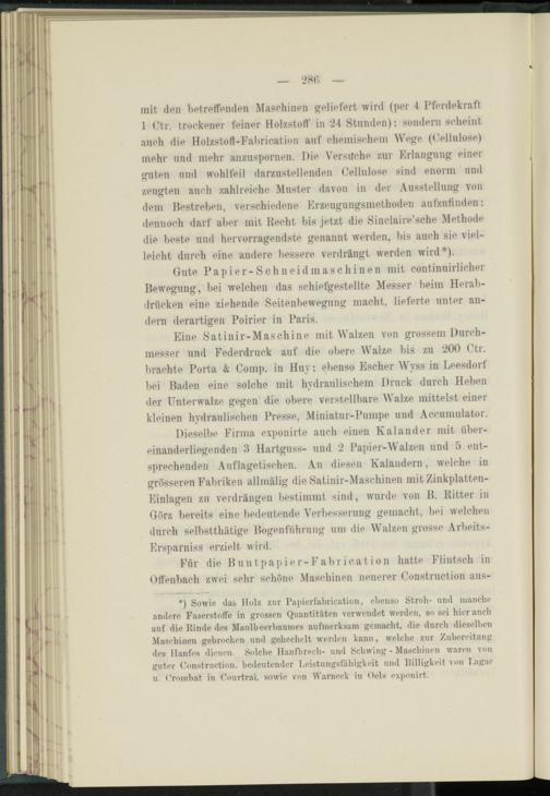 mit don betreffenden Maschinen geliefert wird (per 4 Pferdekraft 1 (Jtr. trockener feiner Holzstoff in 24 Stunden): sondern scheint auch die Holzstofl-Fabrication auf chemischem Wege (Cellulose) mehr und mehr anzuspornen. Die Versuche zur Erlangung einer guten und wohlfeil darzustellenden Cellulose sind enorm und zeugten auch zahlreiche Muster davon in der Ausstellung von dem Bestreben, verschiedene Erzeugungsmethoden aufzutinden: dennoch darf aber mit Recht bis jetzt die Sinclaire’sche Methode die beste und hervorragendste genannt werden, bis auch sie vielleicht durch eine andere bessere verdrängt werden wird*).