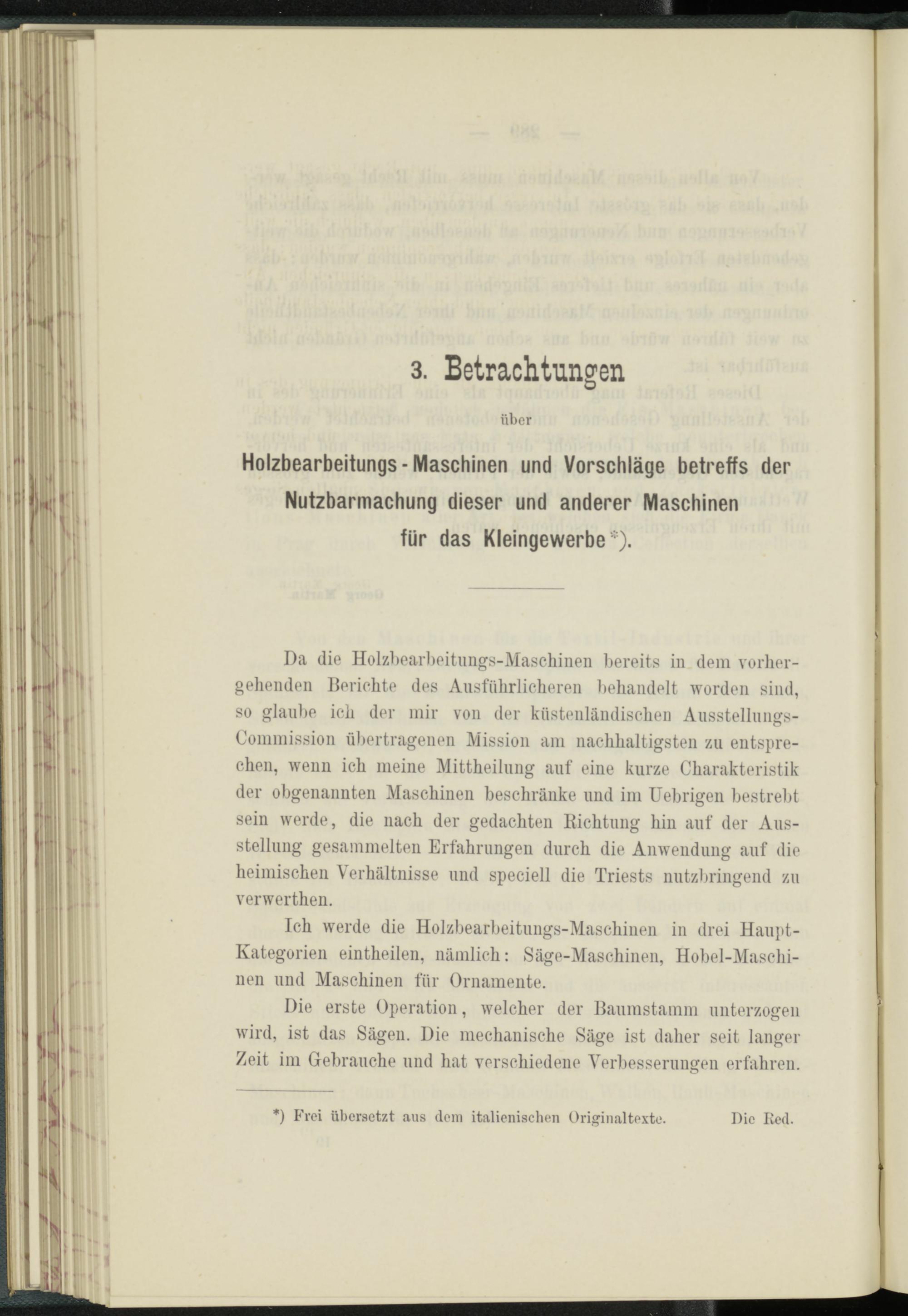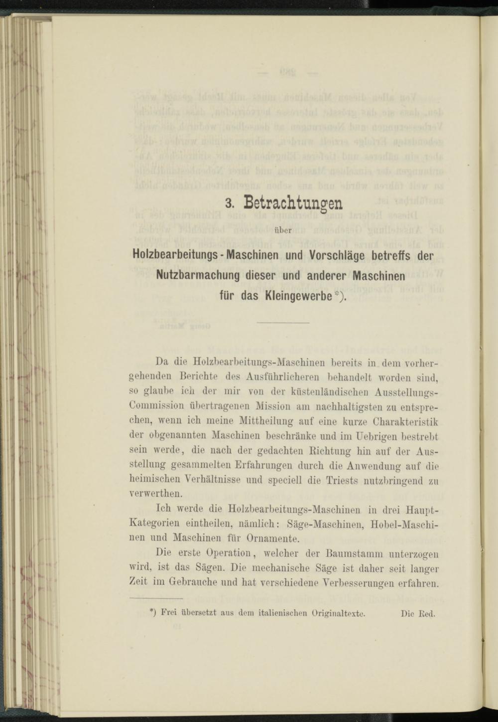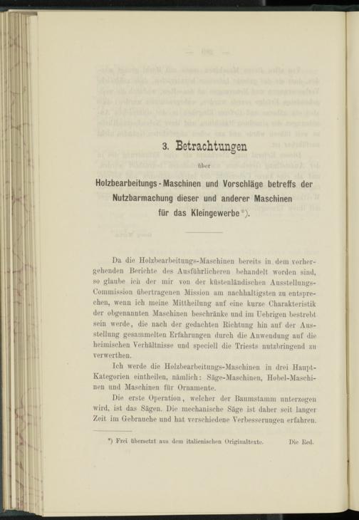 Da die Holzbearbeitungs-Maschinen bereits in dem vorhergehenden Berichte des Ausführlicheren behandelt worden sind, so glaube ich der mir von der küstenländischen Ausstellungs- Commission übertragenen Mission am nachhaltigsten zu entsprechen, wenn ich meine Mittheilung auf eine kurze Charakteristik der obgenannten Maschinen beschränke und im Uebrigen bestrebt sein werde, die nach der gedachten Richtung hin auf der Ausstellung gesammelten Erfahrungen durch die Anwendung auf die heimischen Verhältnisse und speciell die Triests nutzbringend zu verwerthen.