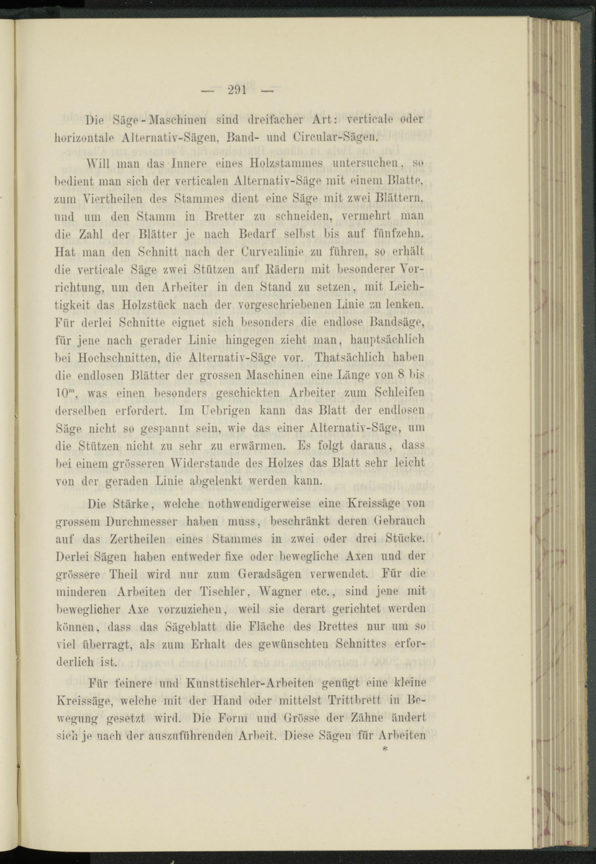 Will man das Innere eines Holzstannnes untersuchen, so bedient man sich der verticalen Alternativ-Süge mit einem Blatte, zum Viertheilen des Stammes dient eine Säge mit zwei Blättern, und um den Stamm in Bretter zu schneiden, vermehrt man die Zahl der Blätter je nach Bedarf seihst bis auf fünfzehn. Hat man den Schnitt nach der Curvenlinie zu führen, so erhält die verticale Säge zwei Stützen auf Bädern mit besonderer Vorrichtung, um den Arbeiter in den Stand zu setzen, mit Leichtigkeit das Holzstück nach der vorgeschriebenen Linie zu lenken. Für derlei Schnitte eignet sich besonders die endlose Bandsäge, für jene nach gerader Linie hingegen zieht man, hauptsächlich bei Hochschnitten, die Alternativ-Säge vor. Thatsäehlich haben die endlosen Blätter der grossen Maschinen eine Länge von 8 bis 10 m , was einen besonders geschickten Arbeiter zum Schleifen derselben erfordert. Im Febrigen kann das Blatt der endlosen Säge nicht so gespannt sein, wie das einer Alternativ-Säge, um die Stützen nicht zu sehr zu erwärmen. Es folgt daraus, dass bei einem grösseren Widerstande des Holzes das Blatt sehr leicht von der geraden Linie abgelenkt werden kann.