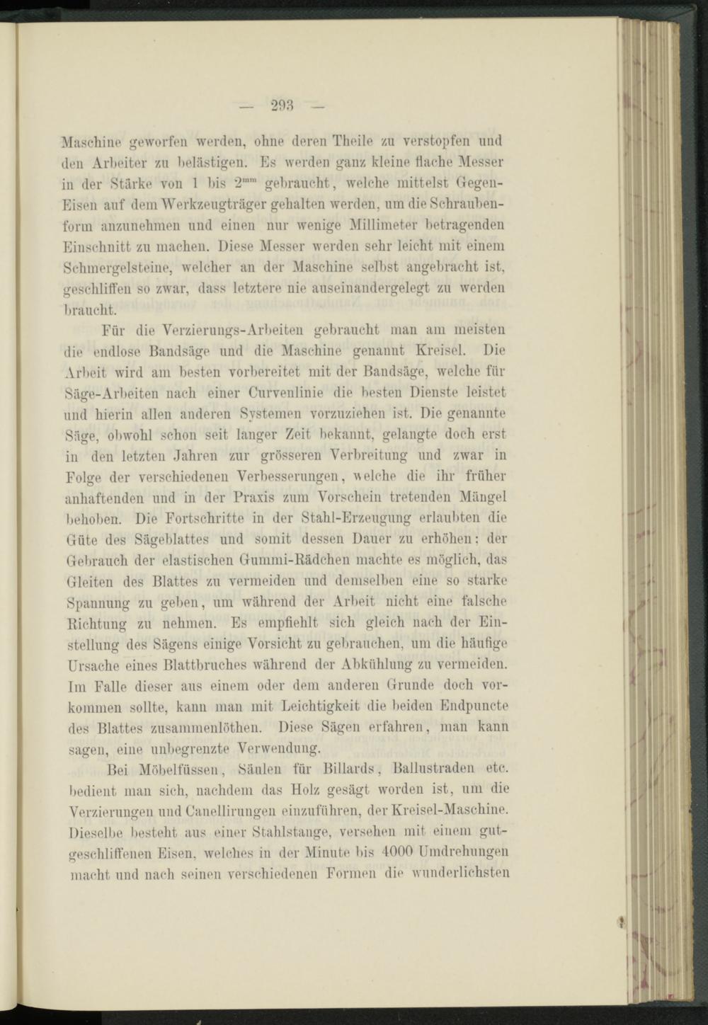 Bei Möbelfüssen, Säulen für Billards, Ballustraden etc. bedient man sich, nachdem das Holz gesägt worden ist, um die Verzierungen und Canellirungen einzuführen, der Kreisel-Maschine. Dieselbe besteht aus einer Stahlstange, versehen mit einem gut- geschliftenen Eisen, welches in der Minute bis 4000 Umdrehungen macht und nach seinen verschiedenen Formen die wunderlichsten
