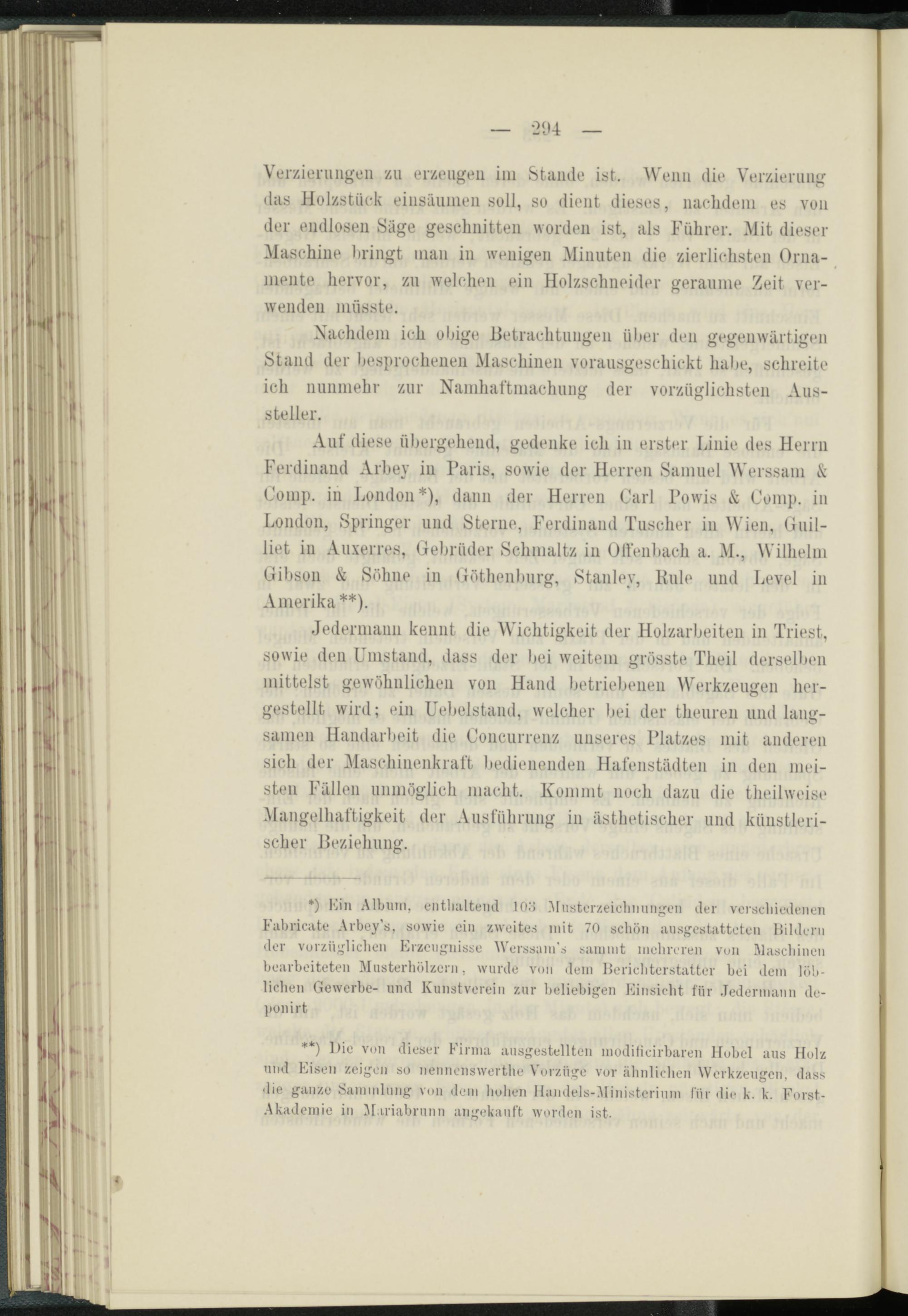 Jedermann kennt die Wichtigkeit der Holzarbeiten in Triest, sowie den Umstand, dass der bei weitem grösste Theil derselben mittelst gewöhnlichen von Hand betriebenen Werkzeugen hergestellt wird; ein Uebelstand, welcher bei der theuren und langsamen Handarbeit die Concurrenz unseres Platzes mit anderen sich der Maschinenkraft bedienenden Hafenstädten in den meisten Fällen unmöglich macht. Kommt noch dazu die theilweise Mangelhaftigkeit der Ausführung in ästhetischer und künstlerischer Beziehung.