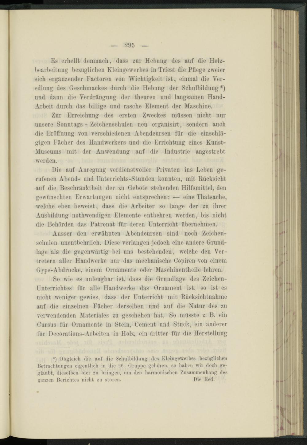 Es erhellt demnach, dass zur Hebung des auf die Holzbearbeitung bezüglichen Kleingewerbes in Triest die Pflege zweier sich ergänzender Factoren von Wichtigkeit ist, einmal die Veredlung des Geschmackes durch die Heining der Schulbildung*) und dann die Verdrängung der theuren und langsamen Hand- Arbeit durch das billige und rasche Element der Maschine.