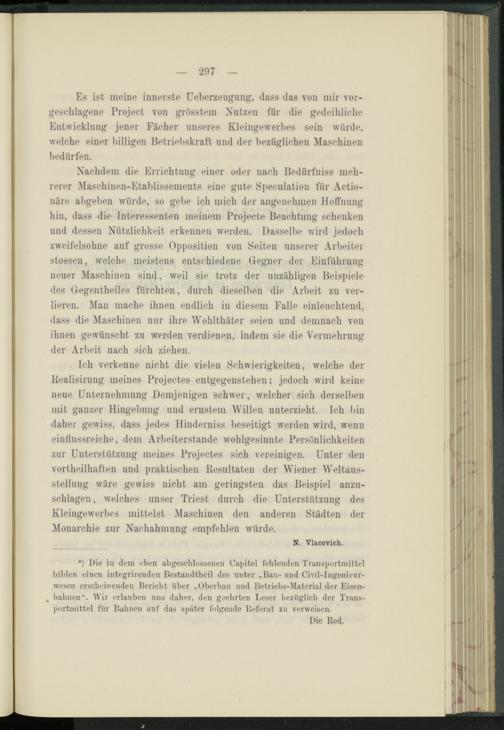 Ich verkenne nicht die vielen Schwierigkeiten, welche der ltealisirung meines Projectes entgegenstehen; jedoch wird keine neue Unternehmung Demjenigen schwer, welcher sich derselben mit ganzer Hingebung und ernstem Willen unterzieht. Ich bin daher gewiss, dass jedes Hinderniss beseitigt werden wird, wenn einflussreiche, dem Arbeiterstande wohlgesinnte Persönlichkeiten zur Unterstützung meines Projectes sich vereinigen. Unter den vorteilhaften und praktischen Resultaten der Wiener Weltausstellung wäre gewiss nicht am geringsten das Beispiel anzuschlagen , welches unser Triest durch die Unterstützung des Kleingewerbes mittelst Maschinen den anderen Städten der Monarchie zur Nachahmung empfehlen würde.