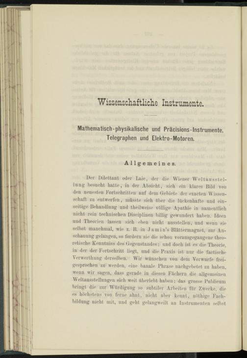 Der Dilettant oder Laie, der die Wiener Weltausstellung besucht hatte, in der Absicht, sich ein klares Bild von den neuesten Fortschritten auf dem Gebiete der exacten Wissenschaft zu entwerfen, müsste sich Alter die lückenhafte und einseitige Behandlung und theilweise völlige Apathie in namentlich nicht rein technischen Disciplinen billig gewundert haben. Ideen und Theorien lassen sich eben nicht ausstellen, und wenn sie selbst manchmal, wie z. B. in damin’s Blättermagnet, zur Anschauung gelangen, so fordern sie die schon vorausgegangenp theoretische Kenntniss des Gegenstandes; und doch ist es die Theorie, in der der Fortschritt liegt, und die Praxis ist nur die factische Verwerthung derselben. Wir wünschen von dem Vorwurfe freigesprochen zu werden, eine banale Phrase nachgebetet zu haben, wenn wir sagen, dass gerade in diesen Fächern die allgemeinen Weltausstellungen sich weit überlebt haben: das grosse Publicum bringt die zur Würdigung so subtiler Arbeiten für Zwecke, die es höchstens von ferne ahnt, nicht aber kennt, nöthige Fachbildung nicht mit, und geht gelangweilt an Instrumenten selbst