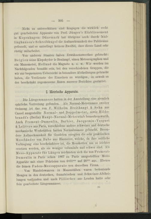 Die Längenmaasse hatten in der Ausstellung eine ziemlich spärliche Vertretung gefunden. Als Normal-Metermaass zweiter Ordnung ist das von F. Wilhelm Breithaupt & Sohn aus Cassel ausgestellte Normal- und Doppel in eter, sowie Hilde- brandt’s (Berlin) Haupt-Normal-Meterstab bemerkenswert!!. Auch Froment-Dumoulin, Barbier, Jacquemin-Verguet & Lelievre aus Paris, verschiedene andere schweizer und deutsche mechanische Werkstätten hatten Normalmaasse gebracht. Besondere Aufmerksamkeit für Geödeten erregten die sehr praktischen Messbänder von Bube aus Hannover, welche, da ihre seitliche Verbiegung eine beschränktere ist, die Messketten^ um so leichter ersetzen werden, als sie weniger voluminös und schwer sind. Als Mess-Apparate für Längen zeichneten sich die von Froment- Dumoulin in Paris schon 1867 zu Paris ausgestellten Mess- Apparate mit einer Präeision von auf 20 mm aus. Ebenso