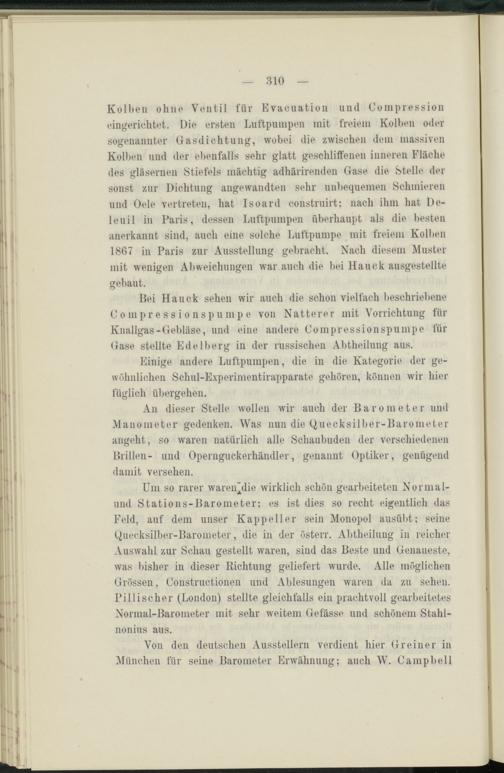 Bei Hauck sehen wir auch die schon vielfach beschriebene Compressionspumpe von Na11erer mit Vorrichtung für Knallgas-Gebläse , und eine andere Compressionspumpe für Gase stellte Edelberg in der russischen Abtheilung aus.